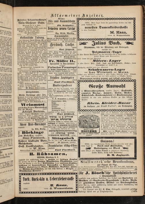 stan Medaillen in allen Ausstellungen erhalten. Zu haben am hiesigen Platze in 1-Pfd, u. i/g-Pfd.-Pack. (engl. Netto-Gew.) nebst Recepten (sehr einfache) bei: J. A. Busch Söhne, E. Fischbach, Heinzerling & Tribus, F. C. Henzerling, L. Kalkhof, L. Müller (en gros & en detail) , G. W. Weidig und allen bedeutenden Ess- u. Materialwaaren-Händlern.