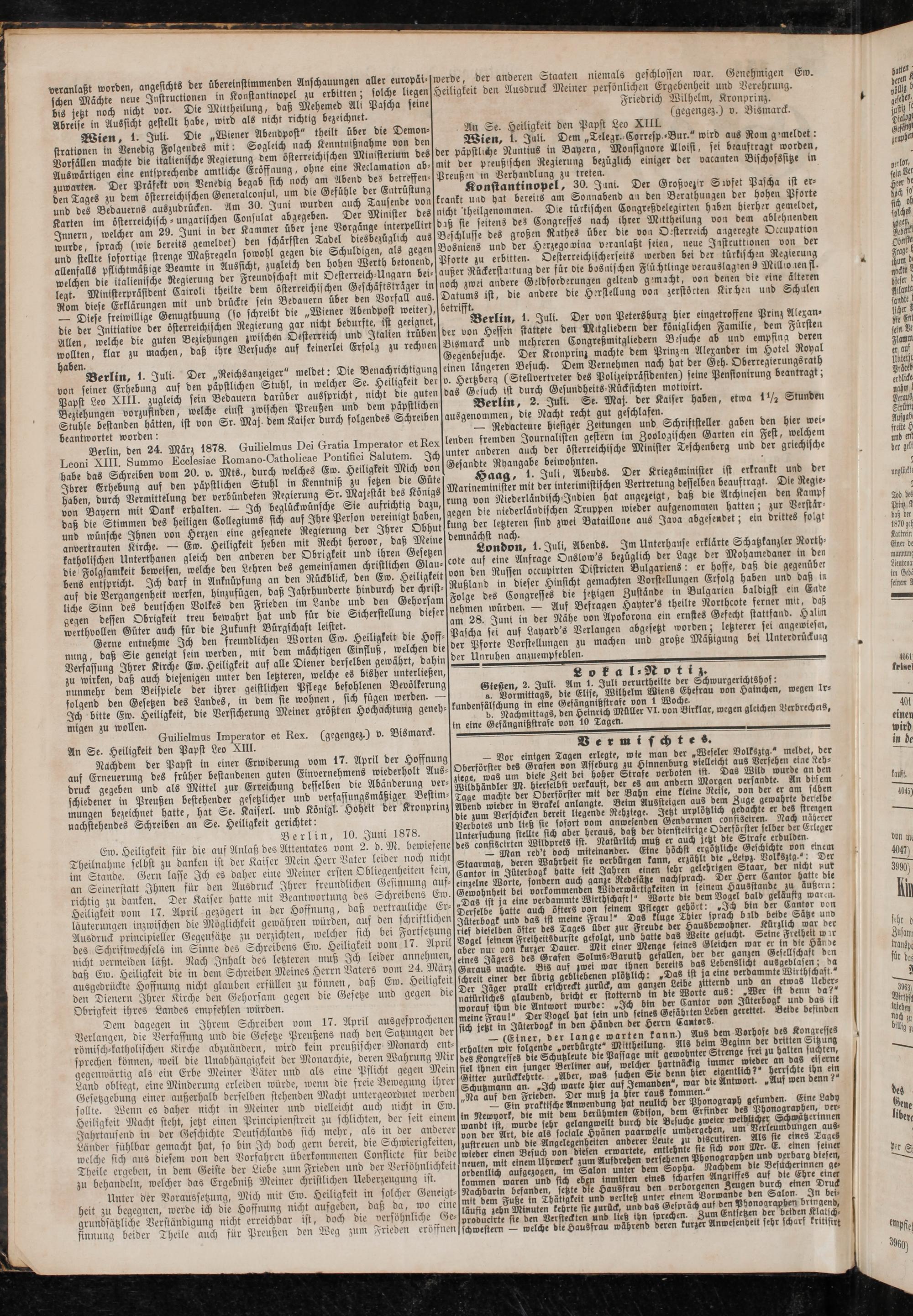 ^"'Berlin, 1. Juli. Der „Reichsanzeiger" meldet: Die Benachrichtigung von seiner Erhebung auf den päpstlichen Stuhl, in welcher Se. Helligkeit der Vavll Leo XIII. zugleich sein Bedauern darüber ausspricht, nicht die gitten Beziehungen^ vorzufinden, welche einst zwischen Preußen und dem päpstlichen Smhle bestanden hätten, ist von Sr. Maß dem Kaiser durch folgendes Schreiben beantwortet worden: n