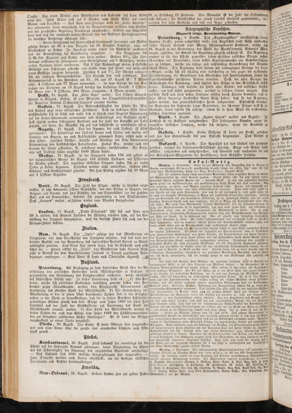 Quelle: Von einem Wechsel oder Modification des Cabinels soll keine Rede 59, in Vicksburg 13 Personen. Von Memphis ist die Zahl der Gestorbenen mehr sein. Fürst Milan reist aus 6 Wochen nach Risch, Ristic auf einen nicht bekannt; die Sterblichkeit hat jedoch daselbst ebenfalls zugenommen, na Monat nach Karlsbad. — Aus Rom vom Heutigen wird der „Polit. Corresp." mentlich sind viele Geistliche und sehr viel Neger gestorben.