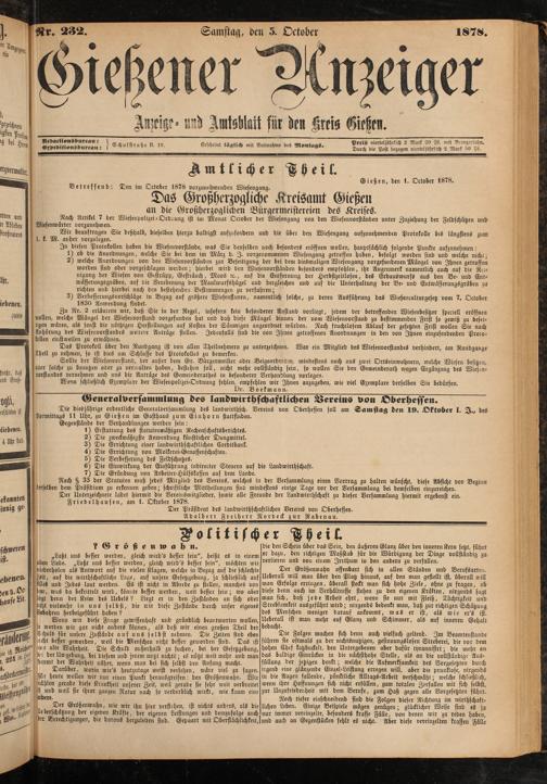 Die diesjährige ordentliche Generalversammlung des landwirthsch. Vereins von Oberhessen soll am Samstag den IS. Oktober l. I., des Vormittags 11 Uhr, zu Gießen im Gasthaus zum Einhorn stattfinden.