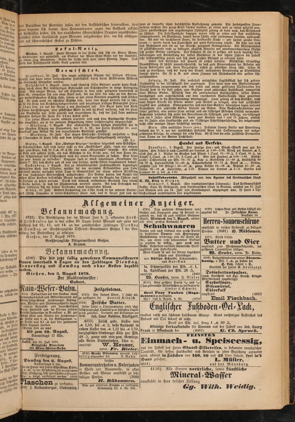 Gießen, 5. August. Heute Morgen in der Frühe ließ sich ein älterer Mann, Korbmacher von auswärts, am Viaduct der Main-Weser-Bahn vor der Neustadt, Jon einem Zug überfahren. Neben der Leiche fand man einen Pfennig liegen. Das Motiv des Selbstmords dürfte Noth gewesen sein.