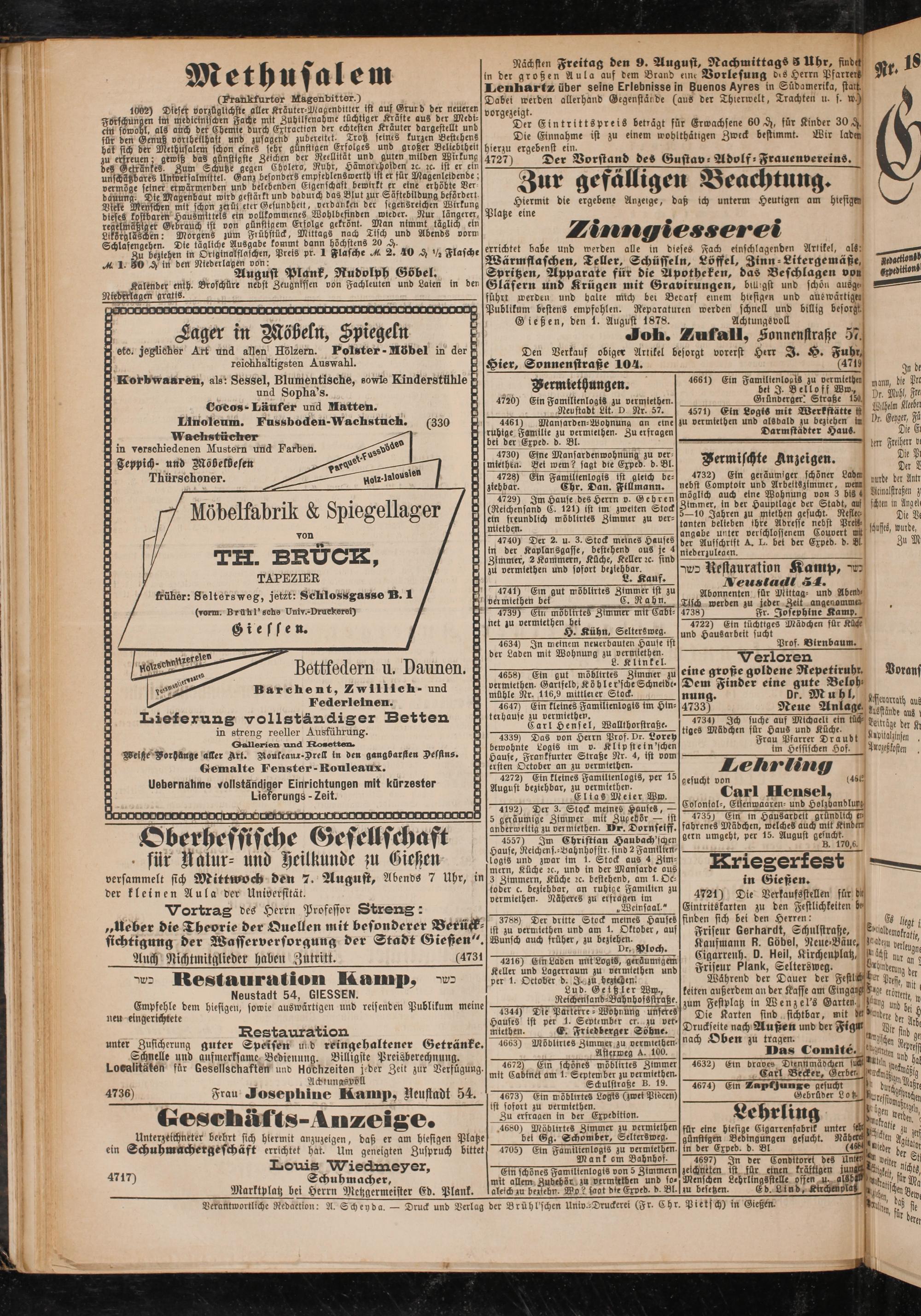 Publikum bestens empfohlen. Reparaturen werden Gießen, den 1. August 1878.