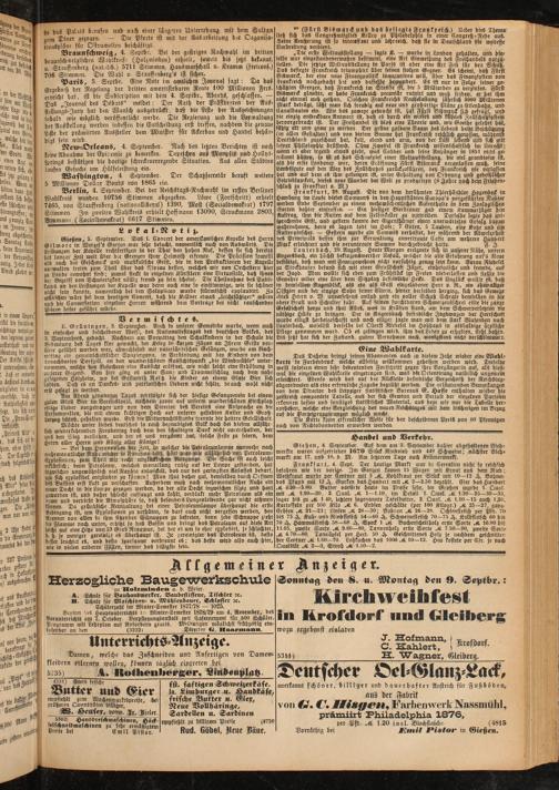 Gießen, 4. September. Auf dem am 3. September dahier abgehaltenen Vieh- markte waren aufgetrieben 1670 Stück Rindvieh und 449 Schweine; nächster Vieh- markt am 17. und 18. d. M. Am letzteren Tage auch Krämermarkt.