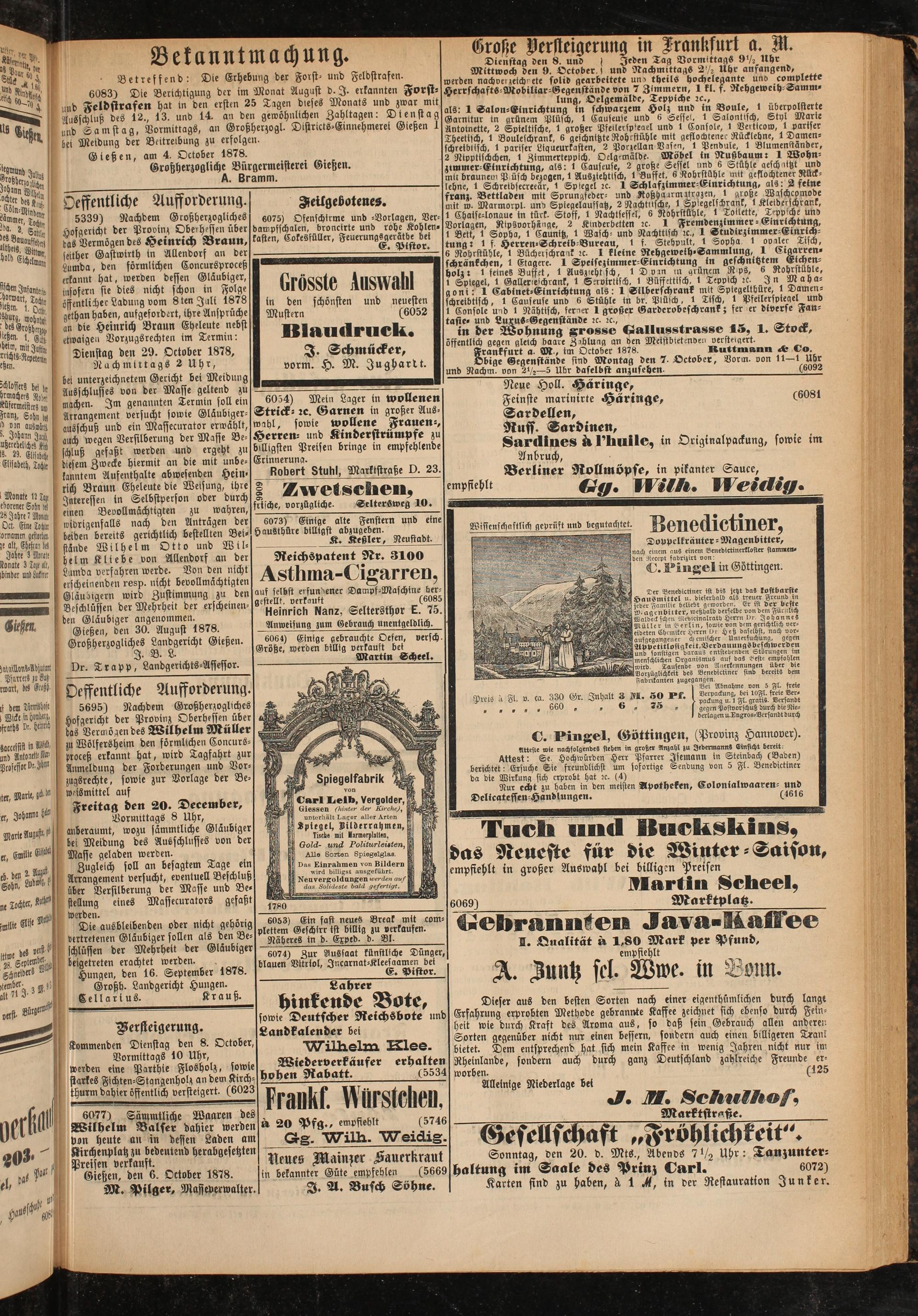 Gießen, den 6. October 1878. M. Pilger, Mast(Verwalter.
