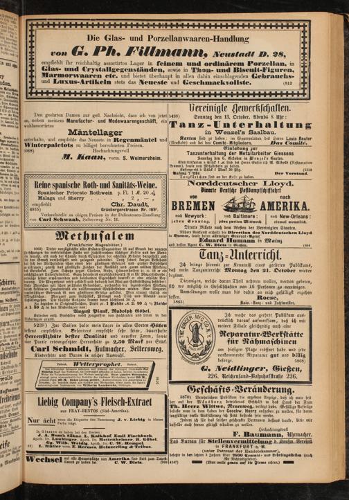 5870) Verehrlichem Publikum die ergebene Anzeige, daß ich mein feit her auf der Mäusburg betriebenes Geschäft in das Haus der Frau Th. Heerz Wittwe, Neuenweg, verlegt habe. Gefällige Aufträge beliebe man in dem Laden der Geschw. Heerz aufgeben zu wollen, für deren sorgfältige reelle Ausführung ich stets bestrebt sein werde.