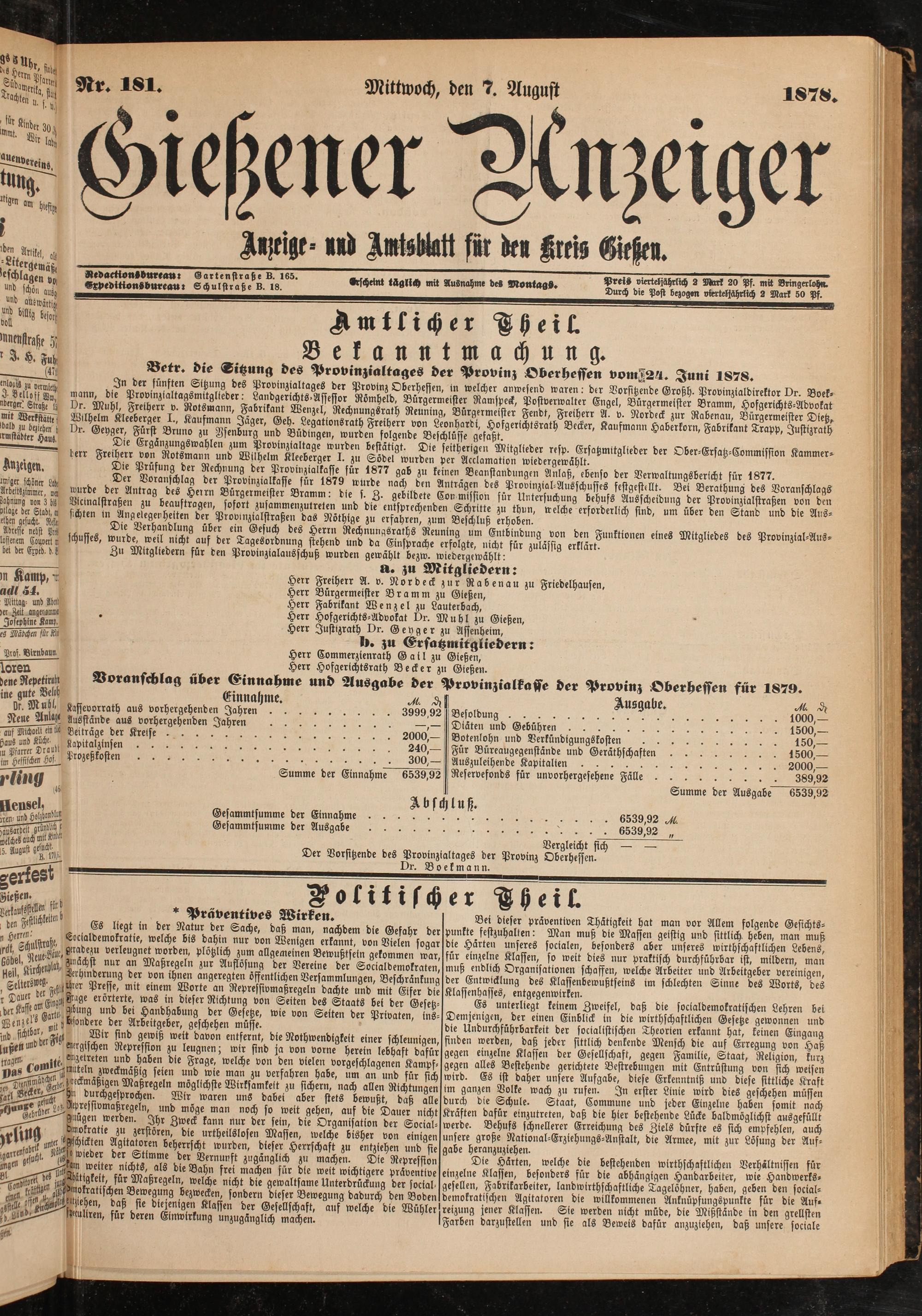Voranschlag über Einnahme und Ausgabe der Provinzialkaffe der Provinz Oberheffen für 1879.