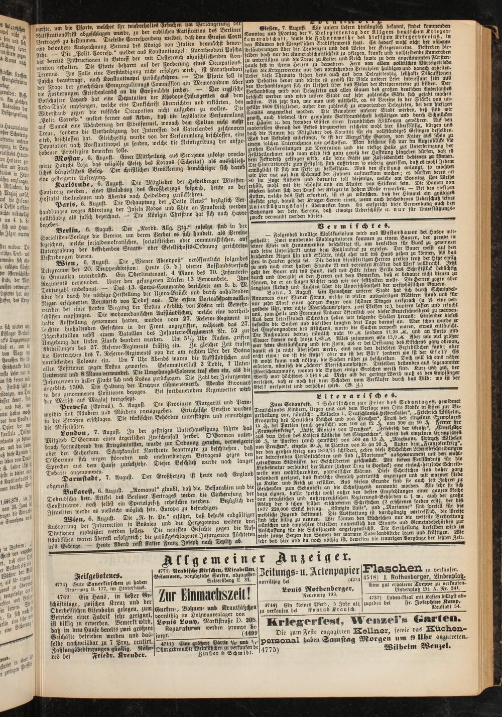 Gießen, 7. August. Wie unfern Lesern hinlänglich bekannt, findet kommenden Sonntag und Montag berV. Delegirtentag der Allgem. deutschen Kriegerkameradschaft, sowie die Fahnenweihe des hiesigen Kriegervereins, in den Räumen des Wenzel'schen Etablissements statt- Es bedarf wohl nicht der naßeren Erläuterungen über die Tendenzen und das Wesen der Kriegervereine. Bestreben die- selberr doch nur de: Kameradschaftlichkeit zu pflegen, kranke und nothleidende Kameraden zu unterstützen und die Treue zu Kaiser und Reich sowie zu dem angestammten Fürstenhause fest in ihrem Herzen zu bewahren. Fern von allem politischen Parteigetriebe tollen die Kriegervereine nur den vorstehenden Principien huldigen und danach arbeiten. Ueber diese Themata stehen denn auch auf dem Delegirtentag lebhafte Dtscusstonen und Debatten bevor und dürfte es gewiß für Viele unserer Leser interessant sein aus den Verhandlungen sich ein Urtheil über das Wesen der^Kriegervereine: zubllden- D<r Verbandstag wird von Delegirten aus allen Gauen des großen deutschen Baterlandev beschickt werden und wird unsere Stadt auf sehr zahlreiche Gaste sich gefaßt machen müffen. Bis jetzt sind, wie man uns mittheilt, ca. 60 Vereine in der Starke von ur^ gefähr 1600 Mitglieder, außer den zahlreich zu erwartenden Delegirten, bei dem hiesigen Comitä angemeldet worden. Die Bewohner unferer Stadt werden, deß sind wir gewiß, auch diesmal ihre gewohnte Gastfreundschaft btthatigen und burd) ^mMen der Häuser rc. den fremden Gästen einen freundlichen Willkomm gewahren- Aus den i materiellen Genuß des Festes hinzuweisen erscheint wohl bier überflüssig, bürgen und > doch die Namen der Mitglieder des ComitLs für ein vollständiges Me ngen desselben. ' Was den Feftplatz anbelangt, so ist der Wenzel sche Garten, von Natur aus schon zu : einem solchen Unternehmen wie geschaffen. Man beschaue sich nur im Augenblicke die großen Vorbereitungen zur Decoration und die riesige Halle zur Unterbringung der Festtheilnehmer und man wird sich ganz gewiß der Hoffnung hingeben dürfen, daßS dem Festwirth gelingen wird, alle feine Gaste zur Zufriedenhttt bedienm M kön nen. Dtt Ätrittspreffe zum Festplatz sind außerdem so niedrig gegriffen, daß es wohl Jedem ermöglicht ist sich am Feste zu betheiligen. Was den Fest zu g an langt, so möchten wir hier nur auf den Schmuck der Fahnen aufmerksam machen; es dürsten deren an *0 ta Zug- Ml-rn und darunt.r soll d -i-nlg-, we»- am Sonmag ihr-W-th.