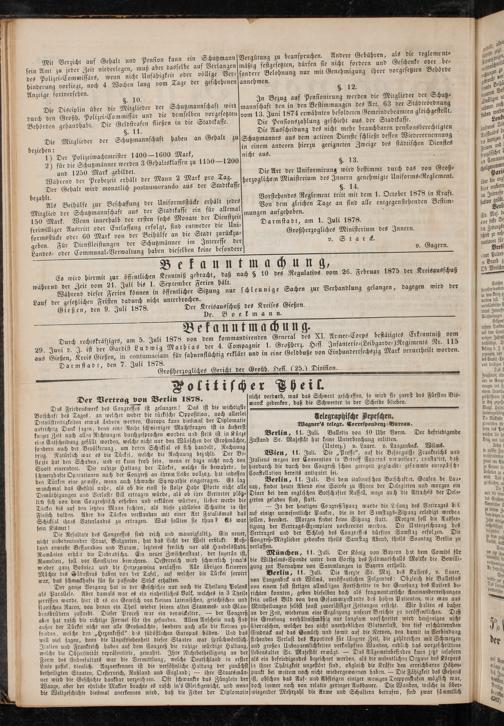 Der ganze Vorgang hat in der Geschichte nur noch dte Theilung Polens als Parallele. Aber damals war es ein einheitliches Volk, welches in 3 Theile zerrissen wurde, hier ist es ein Gemisch von kleinen lateinischen, griechischen und slavischen Racen, von denen ein Theil wieder seinen alten Stammes- und Glaubensbrüdern zustrebt. Dieser Proceß war ein verwickelter, — der Eongreß aber hat rasch die richtige Formel für ihn gefunden. Allem Anschein nach sind außer der Türkei nicht nur alle Großmächte, sondern auch alle die kleinen zufrieden, welche den „Hexenkessel" des südöstlichen Europas bilden. Und das tritt viel sagen, denn dte Unzufriedenheit dieser Staaten war sprüchwörtlich. Italien und Frankreich haben auf dem Eongreß die ruhige würdige Haltung, welche die Objectivität repräsentirte, gewahrt. Ihre Nichtbetheiligung an der Form des Endresultats war die Vermittlung, welche Deutschland in erster Linie zufiel, dienlich. Anzuerkennen ist die versöhnliche Haltung der zunächst betheiligten Staaten, Oesterreich, Rußland und England; — ihre Staatsmänner wird die Geschichte dankbar verzeichnen. Ost schwankte das Zünglein der Waage, aber der ehrliche Makler brachte es rasch in's Gleichgewicht, und wenn dte Weltgeschichte diesmal anerkennen wird, daß die Feder der Diplomatie