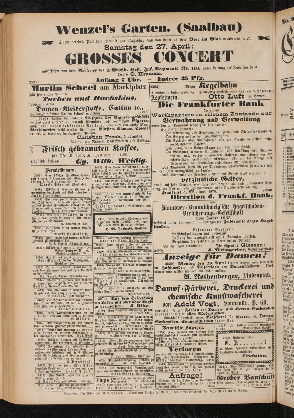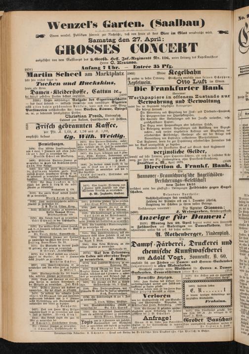 Auch übernimmt die Frankfurter Bonk ans Grund ihres Reglements verzinsliche Gelder, sowohl auf feste Termine, gegen Depositen-Scheine, als auch in laufender Rechnung, zur Zeit mit 2% Zinsvergütung, ohne Provisions-Berechnung.