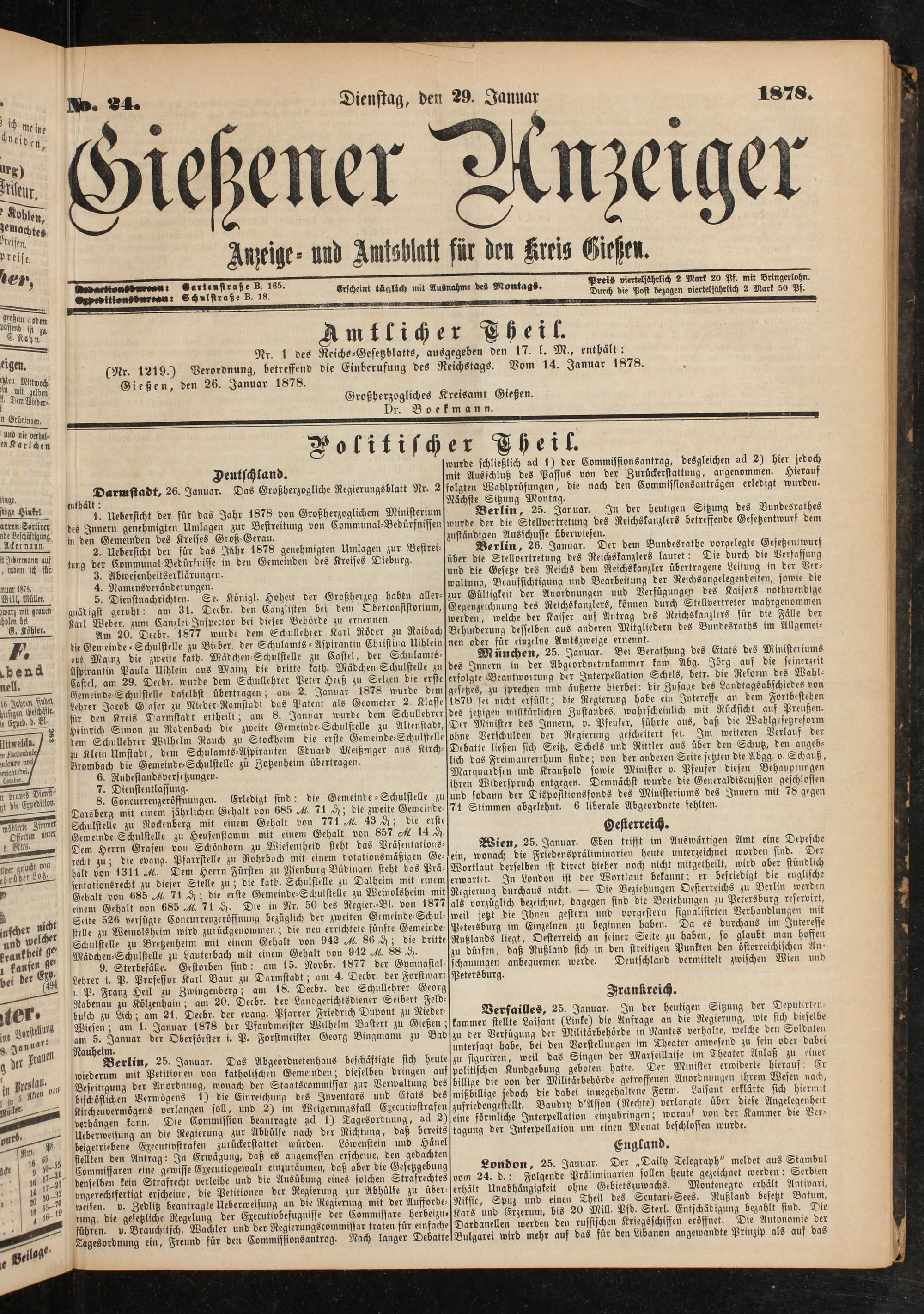 Darmstadt, 26. Januar. Das Großherzogliche Regierungsblatt Nr. 2 fUtbälV. Ueberficht der für das Jahr 1878 von Großherzoglichem Ministerium des Innern genehmigten Umlagen zur Bestreitung von Communal-Bedürsnissen in den Gemeinden des Kreises Groß-Gerau.