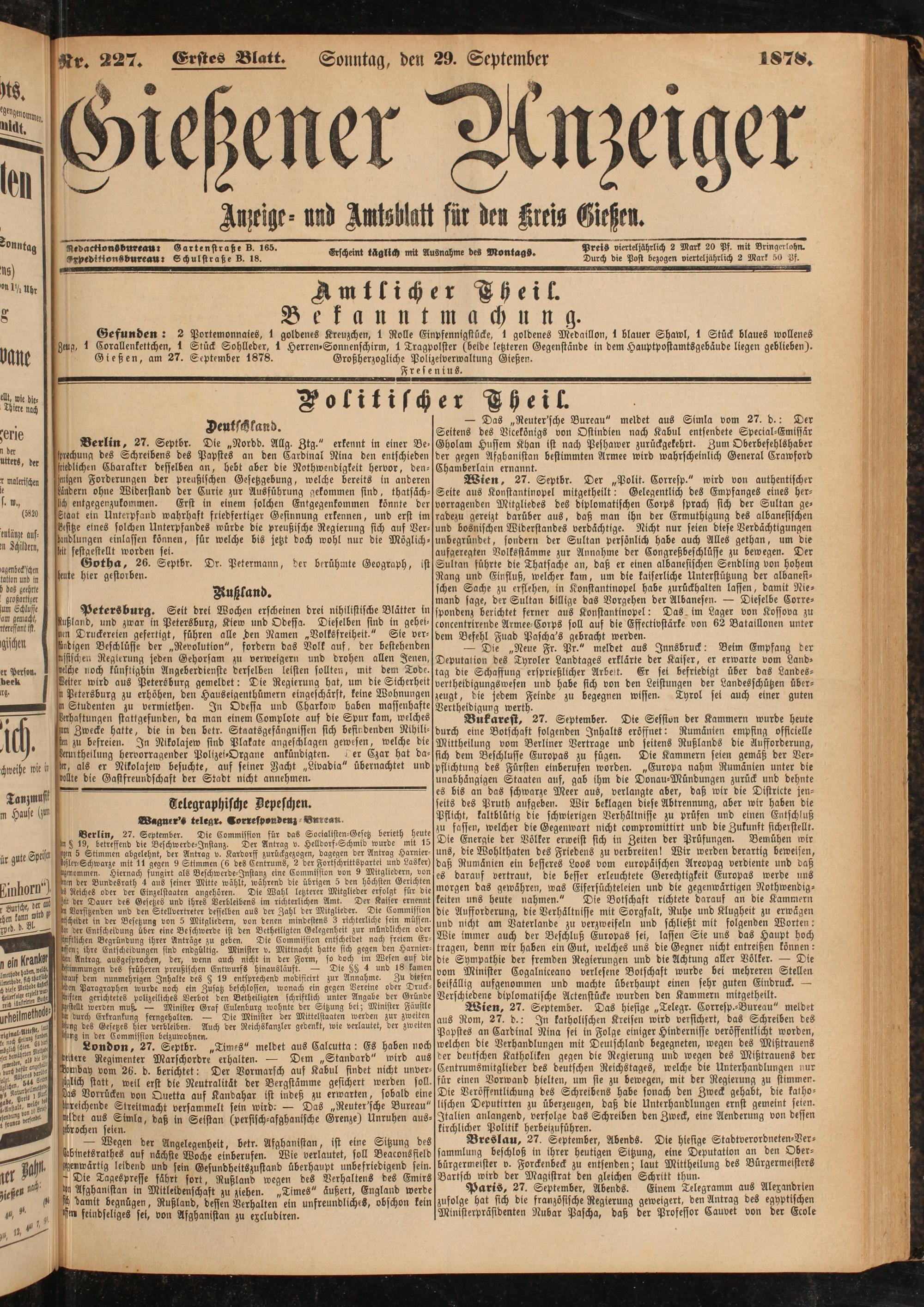 Gefunden: 2 Portemonnaies, 1 Zeug, 1 Corallenkettchen, 1 Stück Sohlleder, Gießen, am 27. September 1878.