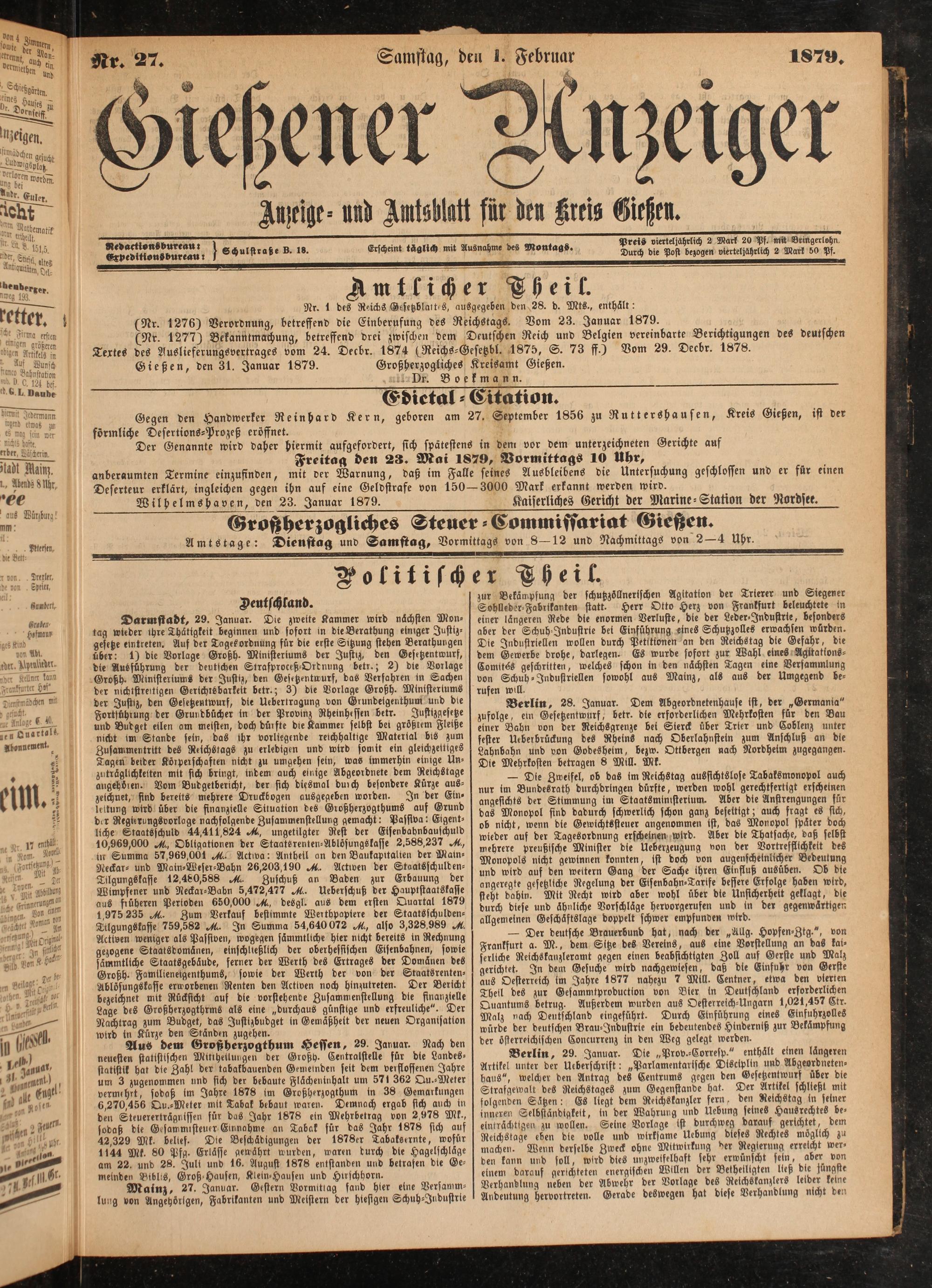 Gießen, den 31. Januar 1879. Großherzogliches Kreisamt Gießen.