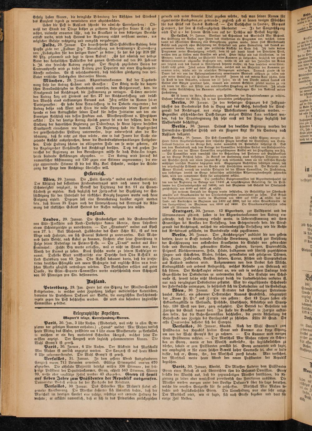 Paris, 30. Januar, 4 Uhr Nachm. Der Rücktritt des Marschalls Mac Mahon ist amtlich angezeigt worden. Der Congreß ist auf heute Abend 6 Uhr zusammenberufen. Die Wahl Grevy's ist gewiß.