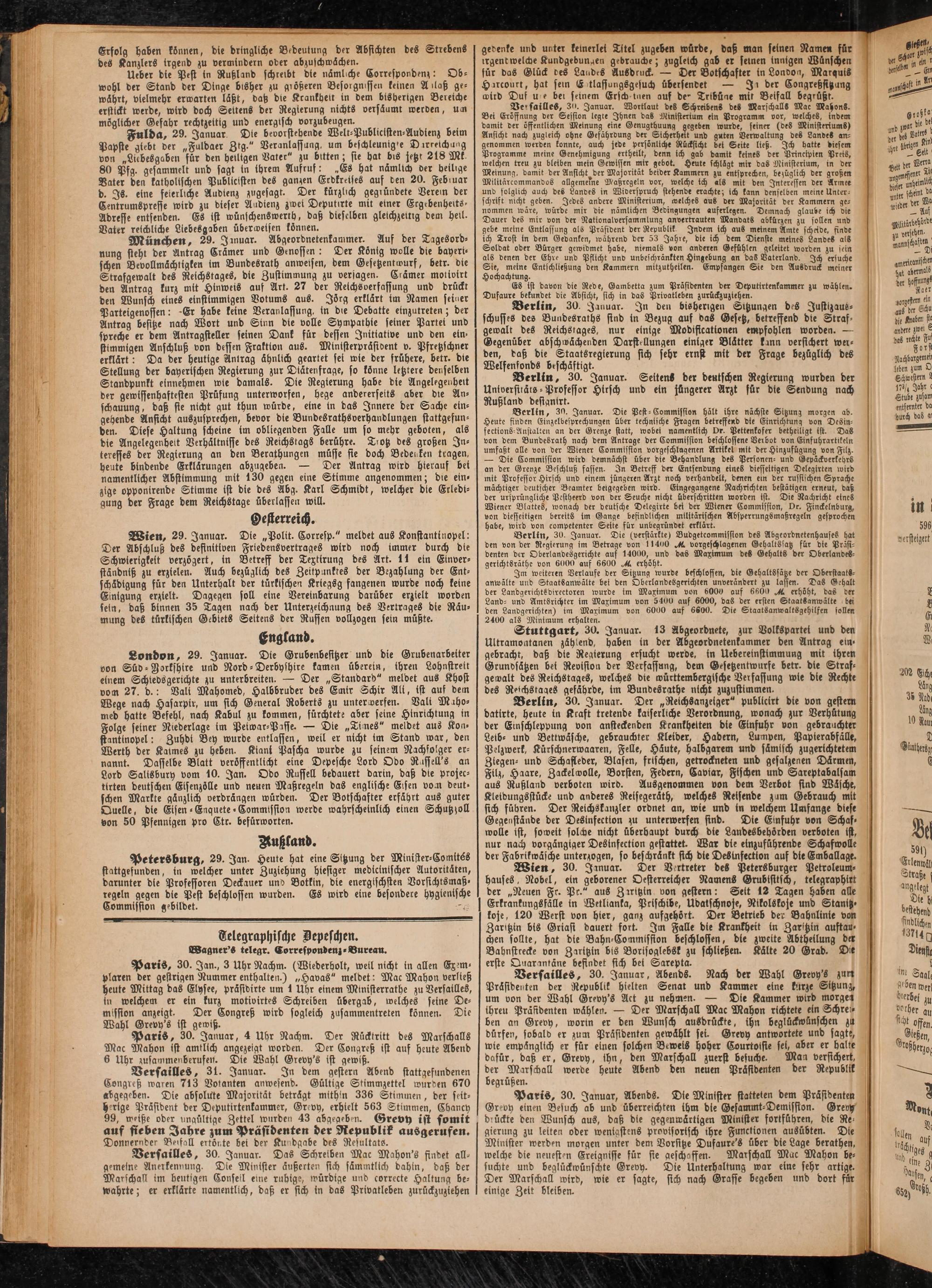 Versailles, 30. Januar, Abends. Nach der Wahl Grevy's zurr Präsidenten der Republik hielten Senat und Kammer eine kurze Sitzunz, um von der Wahl Grevy's Act zu nehmen. — Die Kammer wird morgen ihren Präsidenten wählen. — Der Marschall Mac Mahon richtete ein Schreiben an Grevy, worin er den Wunsch ausdrückte, ihn beglückwünschen zu dürfen, sobald er zum Präsidenten gewählt sei. Grevy antwortete und sagte, wie empänglich er für einen solchen Beweis hoher Courtoifie sei, aber er halte dafür, daß er, Grevy, ihn, den Marschall zuerst besuche. Maa versichert, der Marschall werbe heute Abend den neuen Präsidenten der Republik begrüßen.