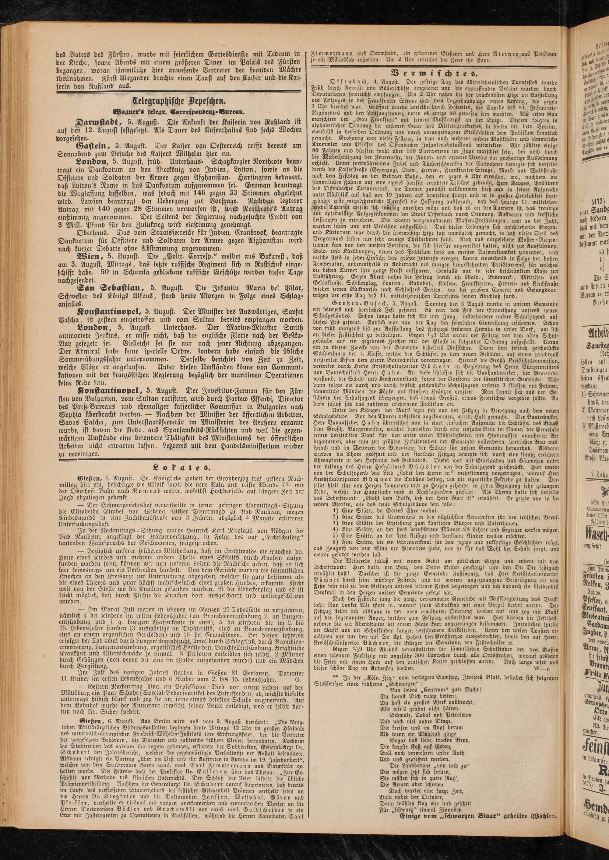Gießen, 6. August. Se. Königliche Hoheit der Großherzog traf gestern Nachmittag hier ein, besichtigte die Klinik sowie die neue Aula und reiste Abends 7 35 mit der Oberhess. Bahn nach Romrod weiter, woselbst Hochderselbe auf längere Zeit der Jagd obzuliegen gedenkt.