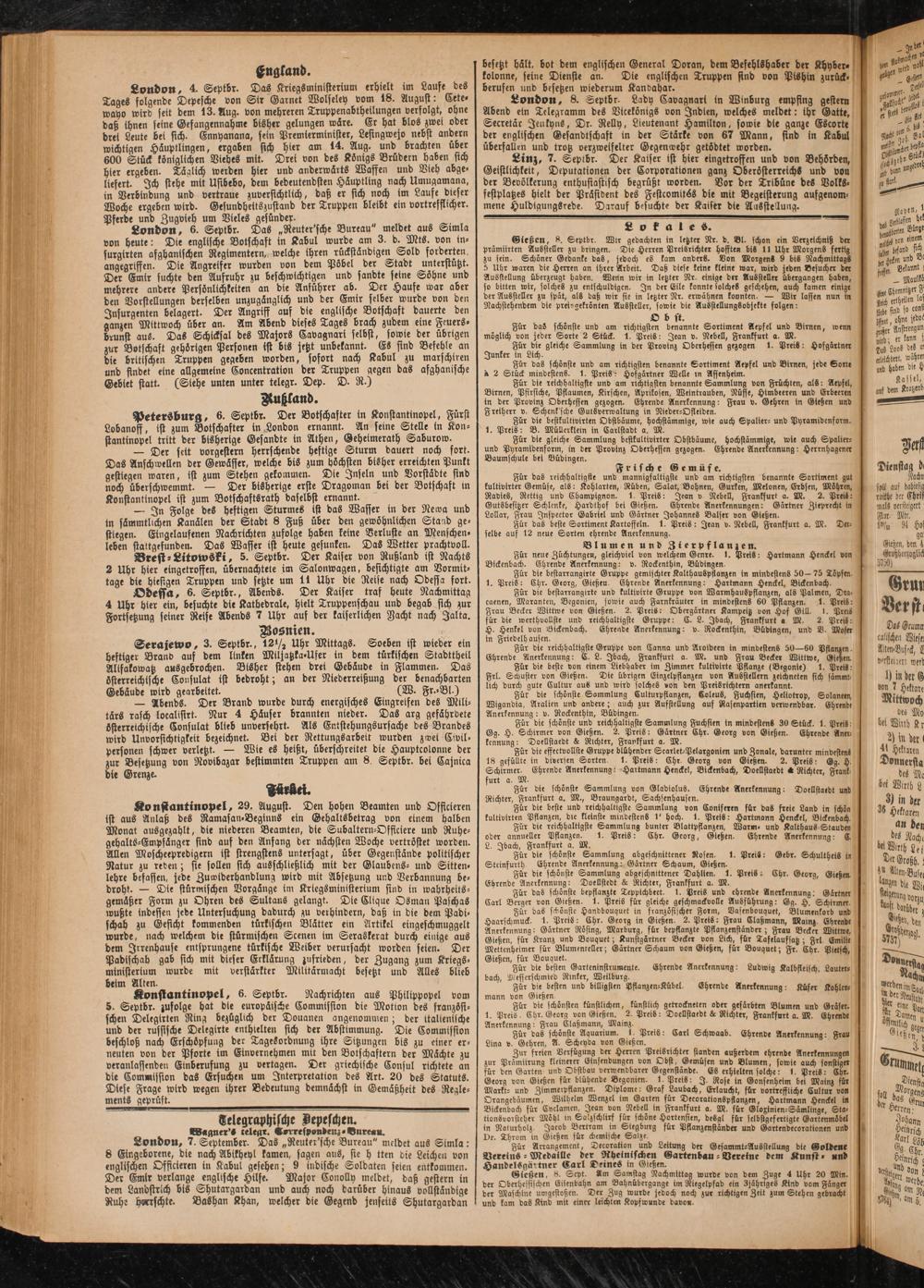 Für das scbönstc Handbouquet in französischer Form, Dasenbouquet, Blumenkorb und Haarschmuck. 1- Preis: Chr. Georg in Gießen- 2. Preis: Frau Claßmann, Mainz. Ehrende Anerkennung: Gärtner Rösing, Marburg, für bepflanzte Pflanzenständer; Frau Becker Wittwe, Gießen, für Kranz und Bouquet; Kunstgärtner Becker von Lich, für Tafelaufsatz; Frl Emilie Mettenheimer für Blumenreller; Gärtner Schaum von Gießen, für Bouquet; Fr. Chr. Pietsch, Gießen, für Bouquet.