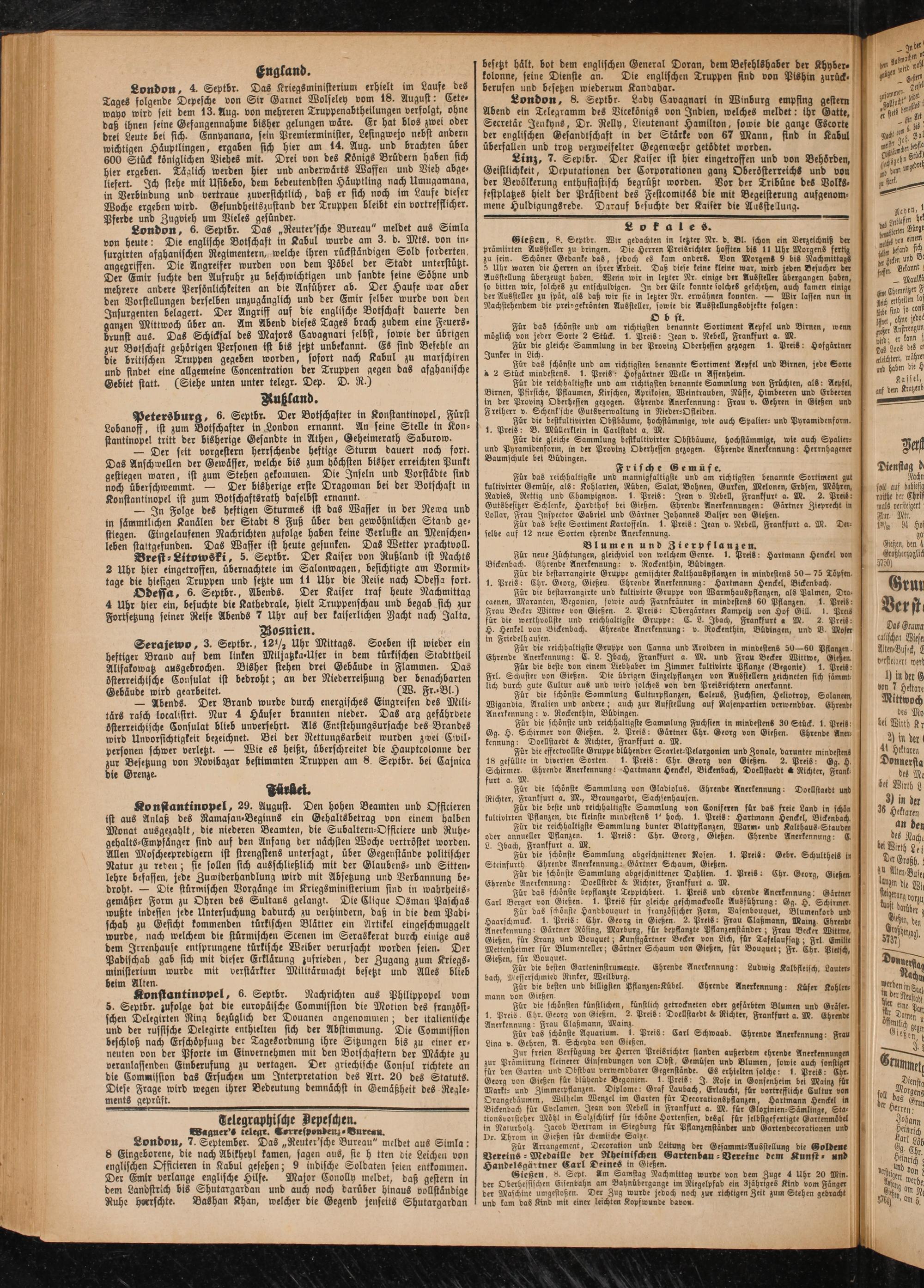 Gießen, 8. Septbr. Wir gedachten in letzter Nr. d. Bl. schon ein Verzeichniß der prämiirten Aussteller zu bringen. Die Herren Preisrichter hofften biS 11 Uhr Morgens fertig zu sein. Schöner Gedanke das, jedoch es kam anders. Von Morgen- 9 bis Nachmittag- 5 Uhr waren die Herren an ihrer Arbeit. Daß diese keine kleine war, wird jeden Besucher der Ausstellung überzeugt haben. Wenn wir in letzter Nr. einige der Aussteller übergangen haben, so bitten wir, solches zu entschuldigen. In der Eile konnte solche- geschehen, auch kamen einige der Aussteller zu spät, als daß wir sie in letzter Nr. erwähnen konnten. — Wir lassen nun in Nachstehendem die preisgekrönten Aussteller, sowie die Ausstellungsobjekte folgen: