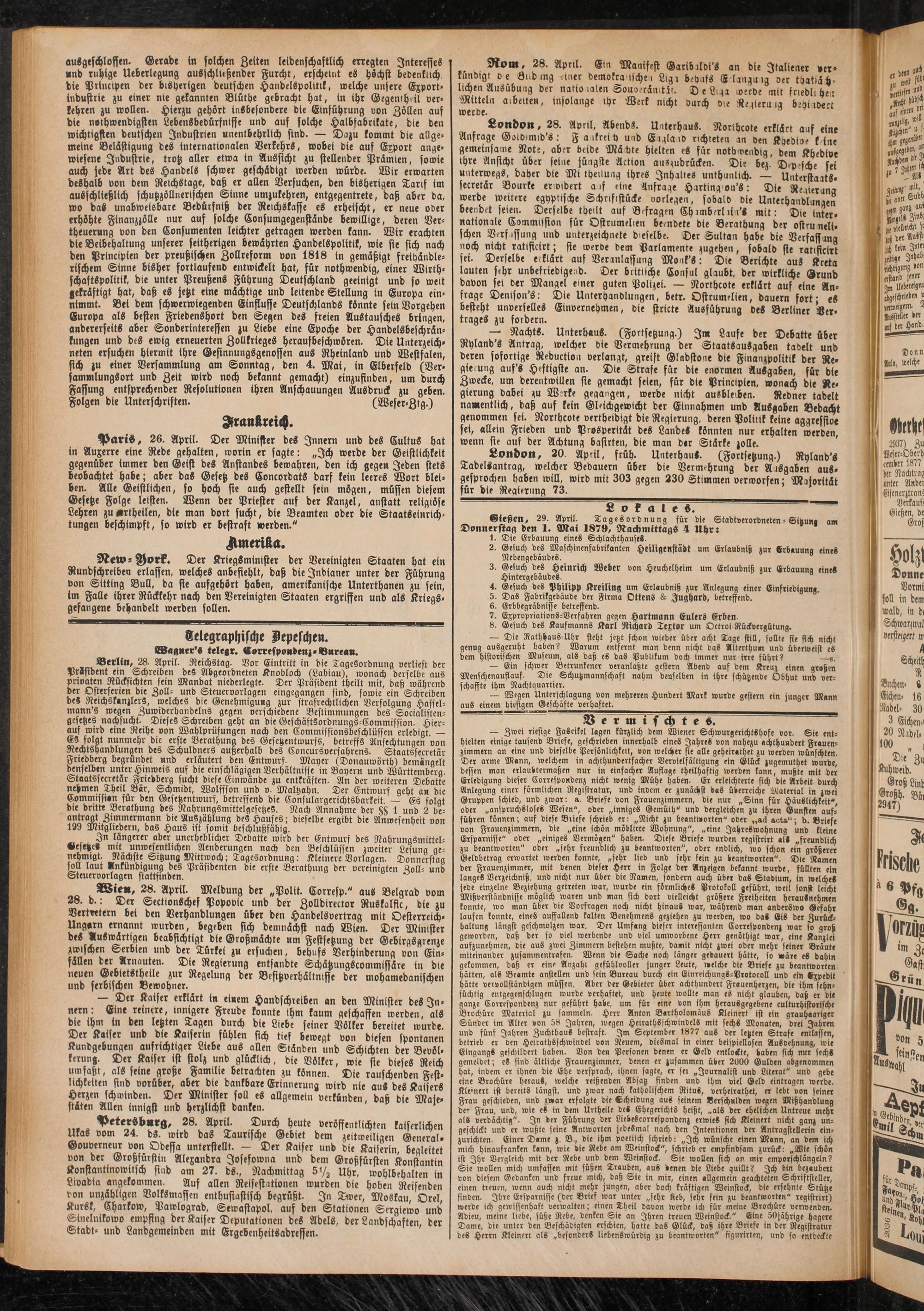 Gießen, 29. April. Tagesordnung für die Stadtverordneten - Sitzuni am Donnerstag den 1. Mai 1879, Nachmittags 4 Uhrr