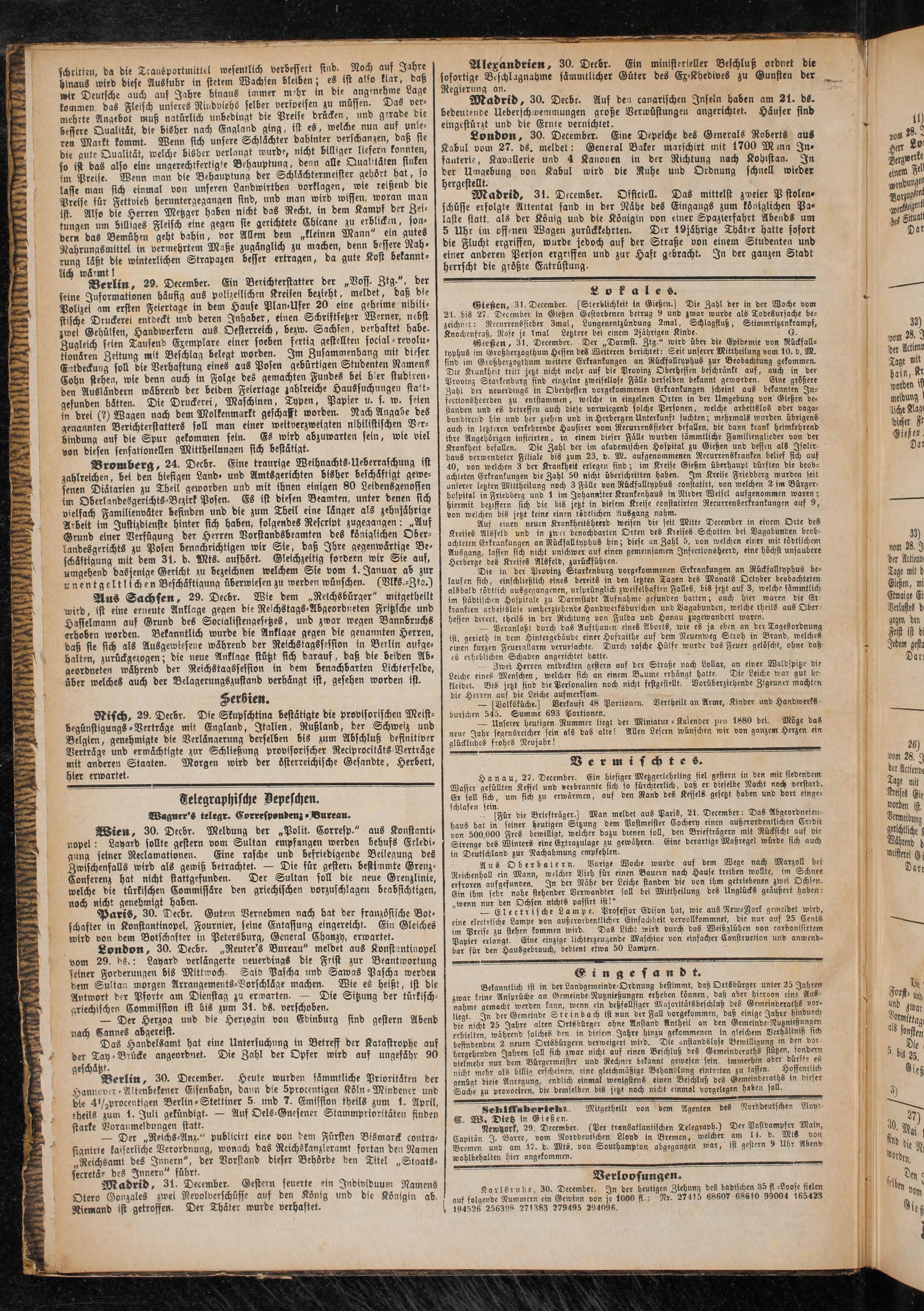 Hanau, 27. December. Ein hiesiger Metzgerlehrling fiel gestern in den mit siedendem Wasser gefüllten Keffel und verbrannte sich so fürchterlich, daß er dieselbe Nacht noch verstarb. Er soll sich, um sich zu erwärmen, auf den Rand des Kessels gesetzt haben und dort eingeschlafen sein. Briefträger.) Man meldet aus Paris, 21. December: Das Abgeordneten, haus hat in seiner heutigen Sitzung dem Postmeister Cochery einen außerordentlichen Eredit von 500 000 Frcs bewilligt, welcher dazu dienen soll, den Briefträgern mit Rücksicht auf die Strenge des Winters eine Extrazulage zu gewähren. Eine derartige Maßregel würde sich auch in Deutschland zur Nachahmung empfehlen.