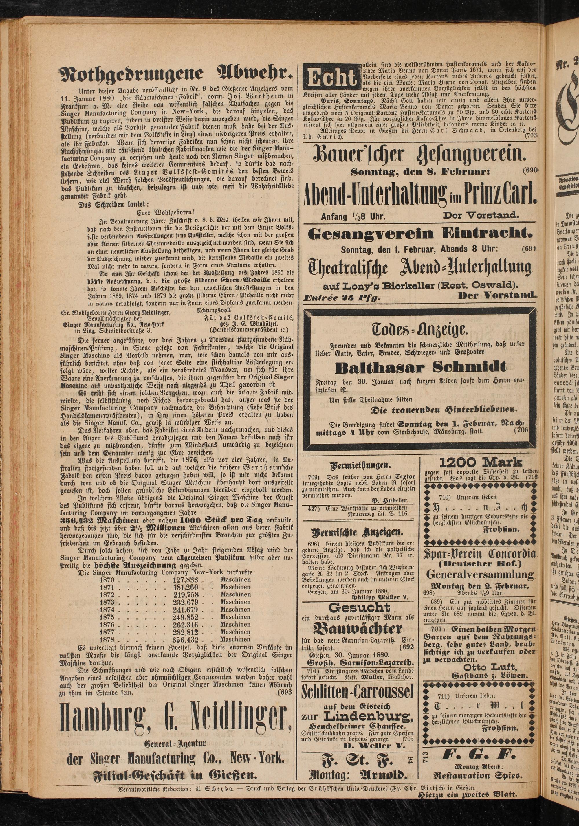 Die Schmähungen und wie nach Obigem ersichtlich wiffentlich falschen Angaben eines neidischen aber ohnmächtigen Concurrenten werden daher wohl auch ber großen Beliebtheit ber Original Singer Maschinen keinen Abbruch zu thun im Staube sein. (693
