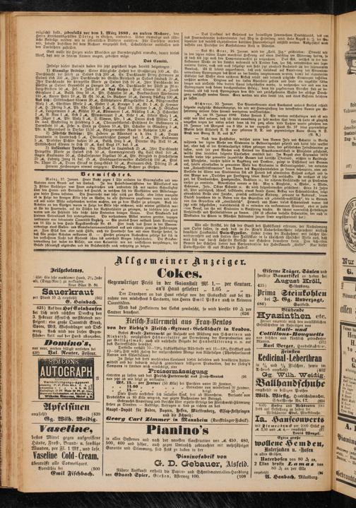 3) Unkündbare Darlehu: Gg. Waldeck in Lauterbach 25 A Ihre Durchlaucht Prinzessin Marie zu SolmS Lich 50 A Commerzienrath Gg. Carl Gail 100 at Eugen Kaufmann 50 A Schulinspector Bigelius 50 A Pfr. Briegleb in Heuchelheim 25 A Ludwig Jung II. das. 25 A Stabsquartiermeister Kalbfleisch 100 A Prof. Dr. Thaer 25 A Decan Strack in Lang-Göns 50 A Kreisamts Geh. Döring 25 at