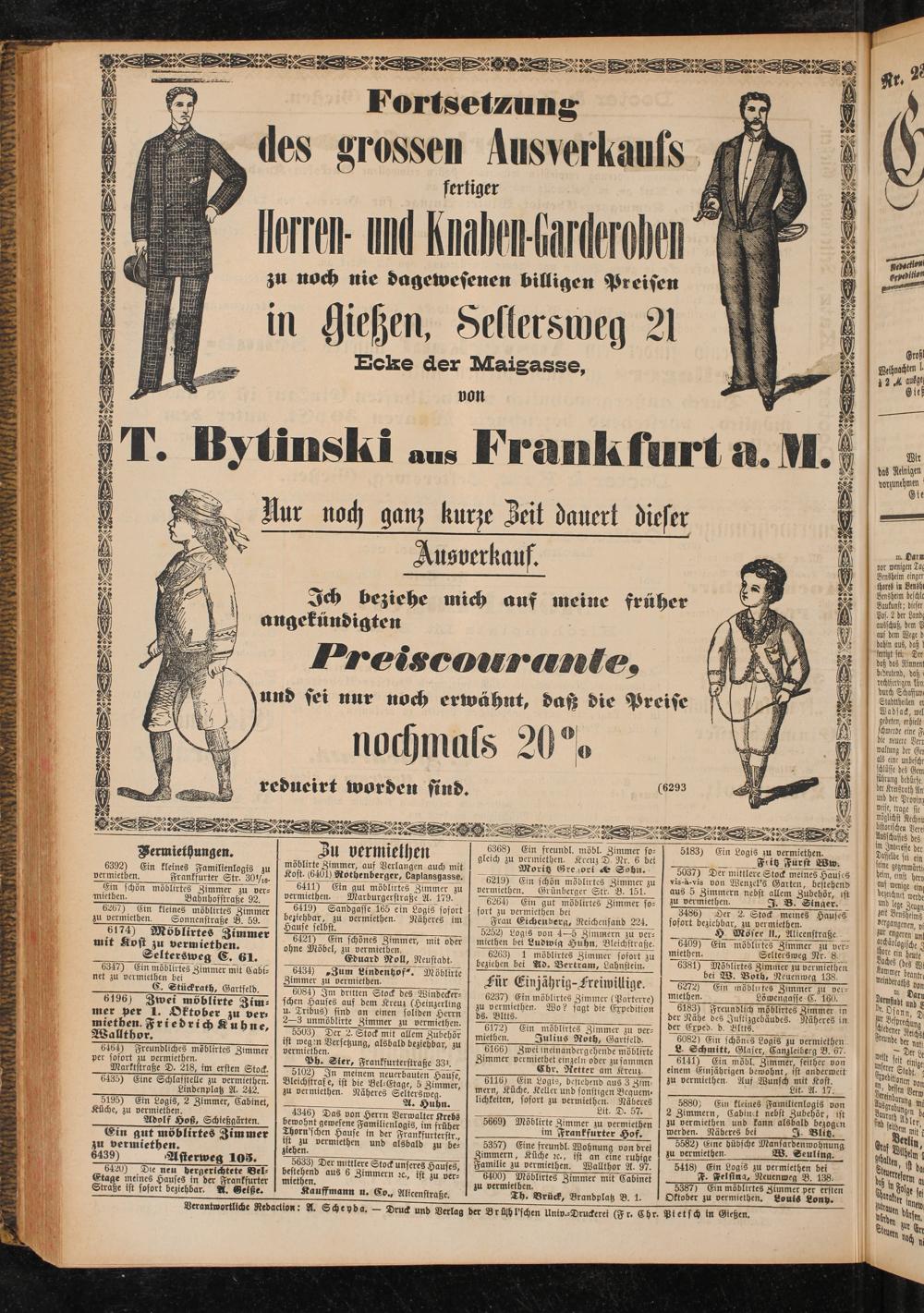 6082) Ein schönes Logis zu vermietheu L Schmitt, Glaser, Canzleiberg B. 67. , 6141) Ein möbl. Zimmer, seither von einem Einjährigen bewohnt, ist anderweit zu vermiethen. Auf Wunsch mit Kost. _______________ Lit- A. 17.