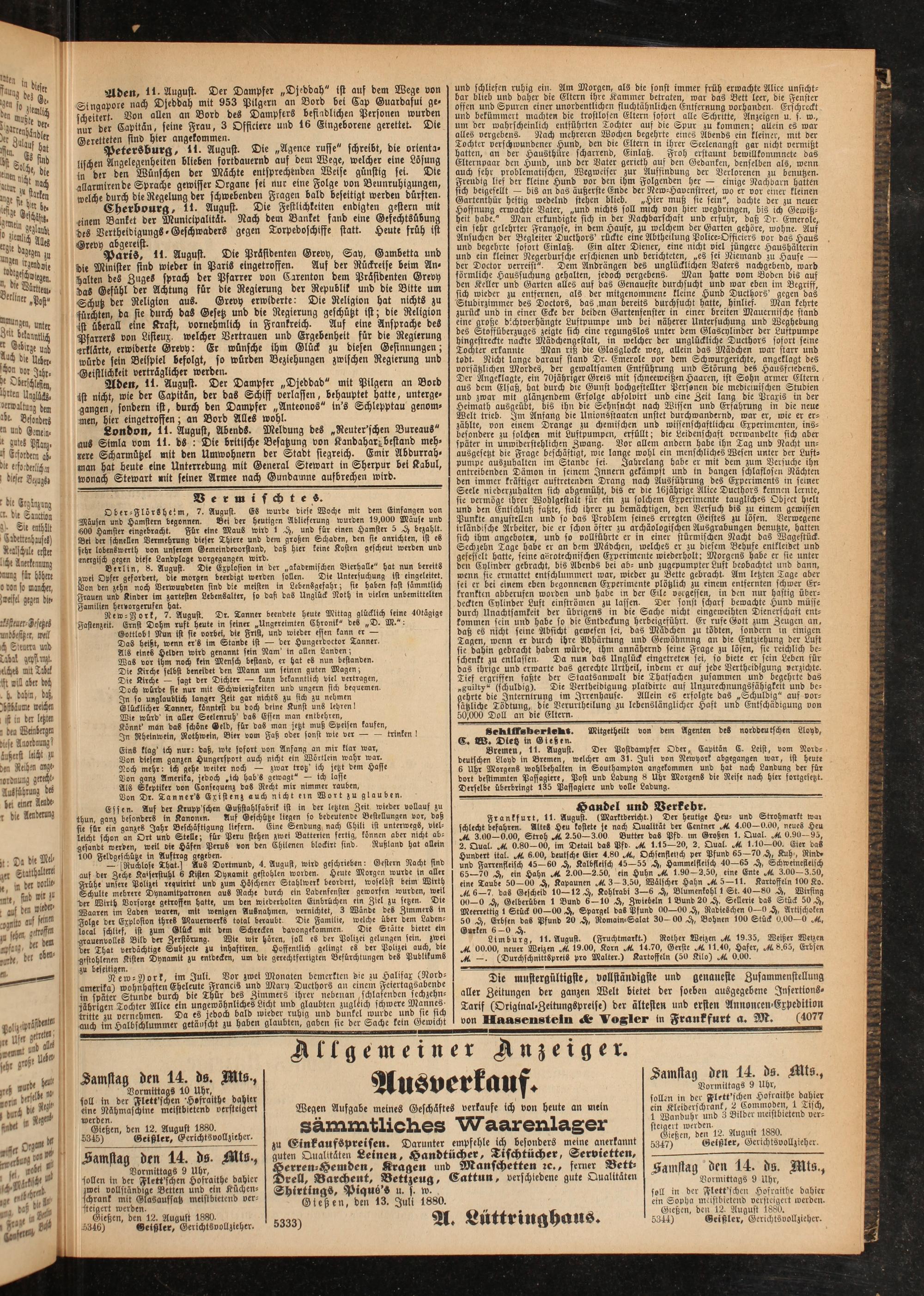 Die mustergültigste, vollständigste und genaueste Zusammenstellung oller Zeitungen der ganzen Welt bietet der soeben ausgegcbene Insertions- Tarif (Original.Zettungspreise) der ältesten und ersten Annoncen-Expedition von Haasensteln Vogler in Frankfurt a. M. (4077