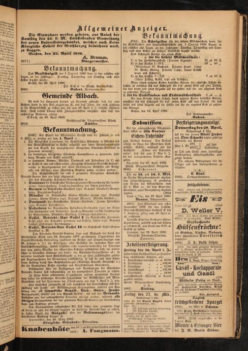 2743) Die Schulgelder für die höhere Mädchenschule, sowie für die Stadtknaben- und Stavtmädchenschule pro I. Quartal 1880 können in den nächsten acht Tagen, an den Zahltagen: Dienstag, Donnerstag und Samstag noch ohne Kosten zur hiesigen Stadtkaffe bezahlt werden.