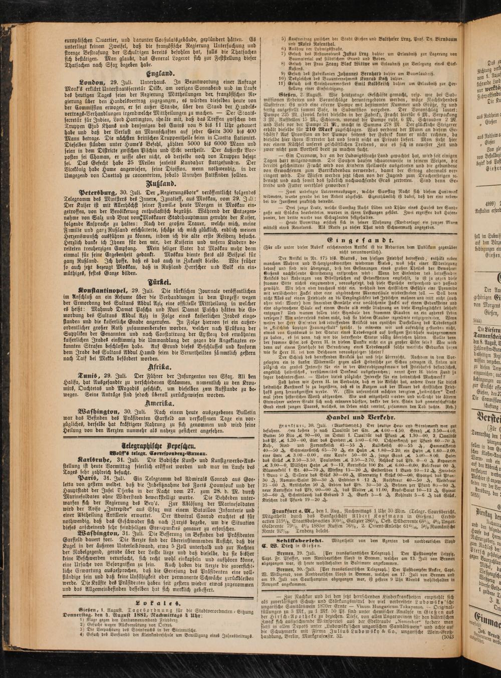 Gießen, 1. August. Tagesordnung für die Stadtverordneten - Sikuna Donnerstag, den 4. August 1881, Stack mittags 4 Uhr- ü 8