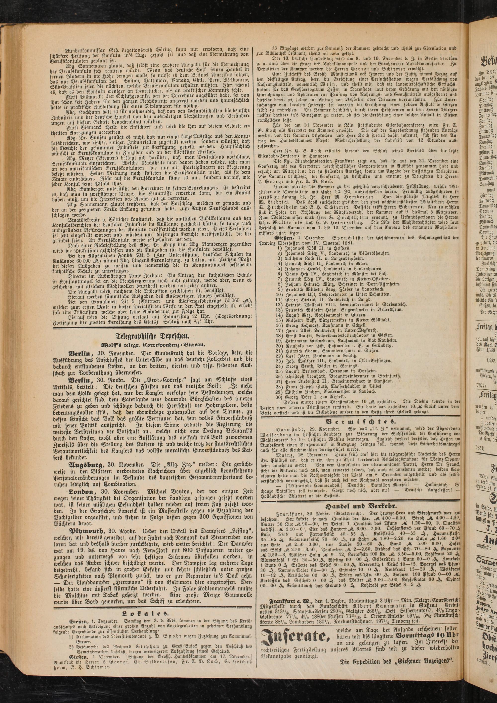 Gießen, 1- December. (Sitzung der Großh. Handelskammer am 17. November.j Anwesend die Herren L. Georgi, Ev. Silbereisen, Fr. C B. Koch, S. Heichel- heim, G. H. Schirmer.