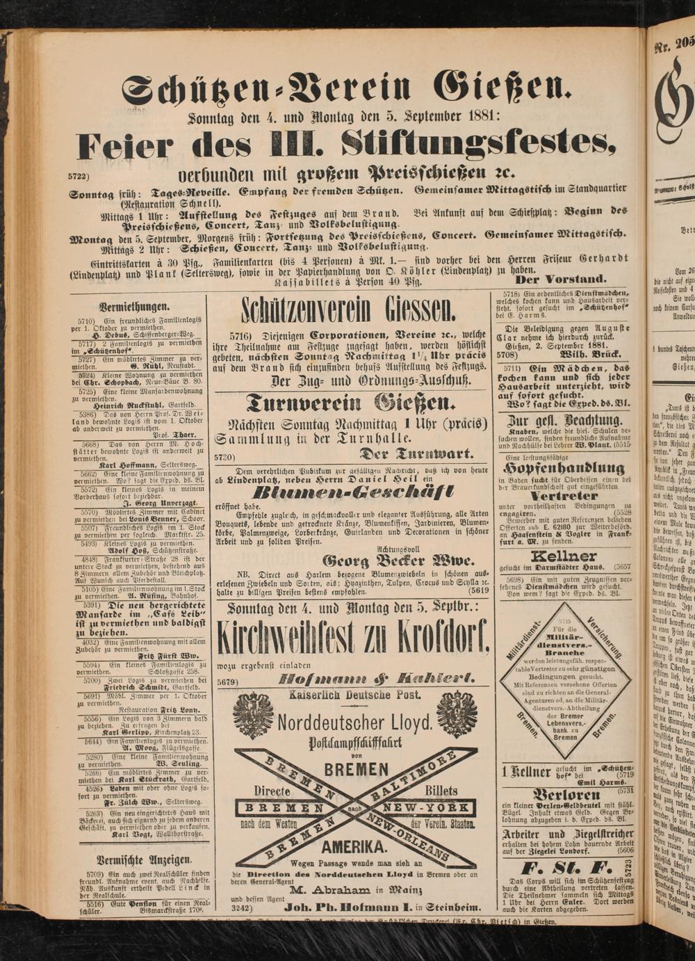 Das Corps will sich im Schützenfestzug durch eine Abtheilung vertreten lassen. Die Theilnebmer sammeln sich Mittags 1 Uhr bei Herrn Euler- Dort werden auch die Karten abgegeben.