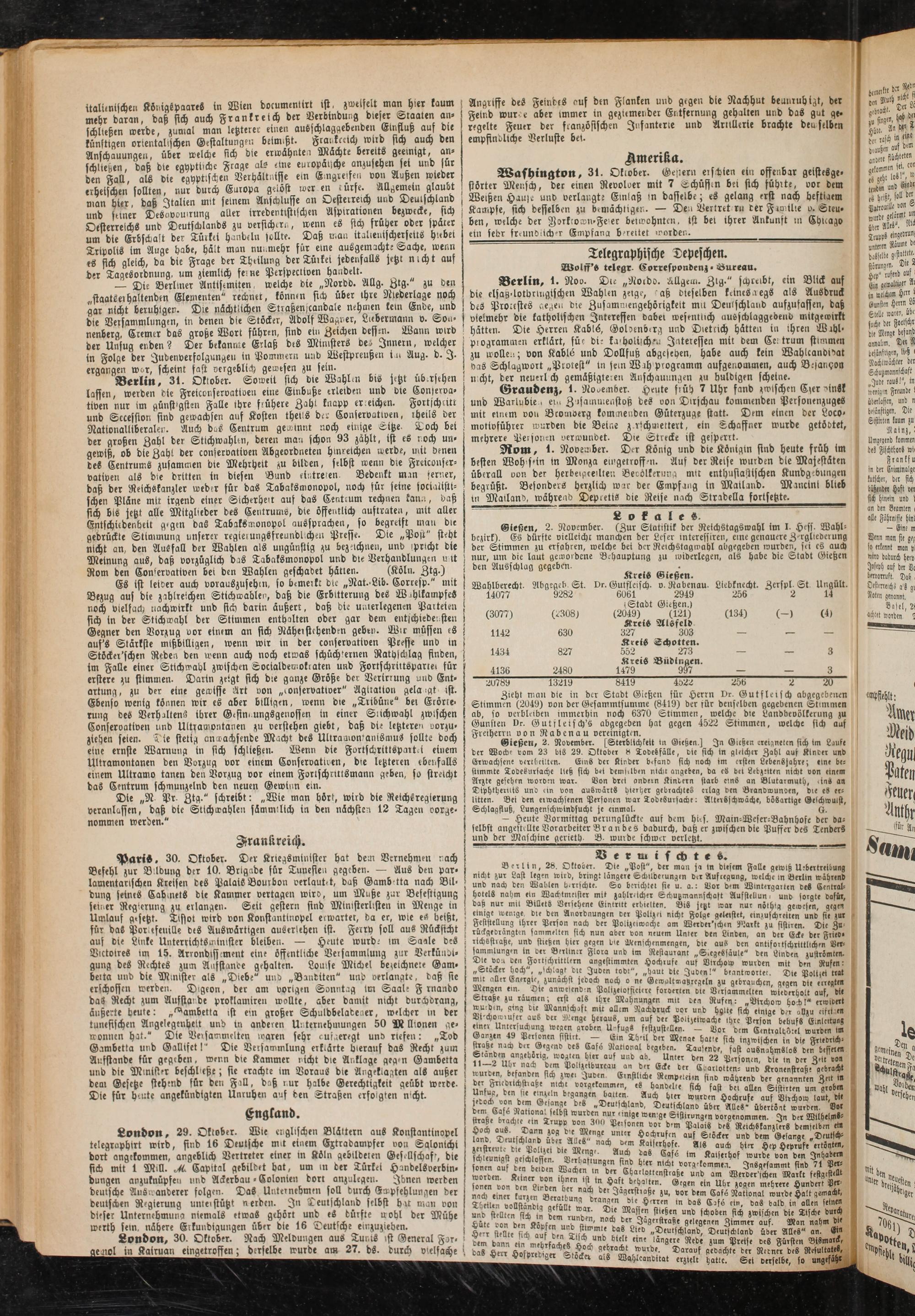 Gießen, 2. November. (Zur Statistik der Reichstagswahl tm I Hess. Wahl- I bezirk). Es dürste vielleichr manchen der Leser mtereffiren, eine genauere Zergliederung | der Stimmen zu erfahren, welche bei der Reichstagmahl abgegeben wurden, sei es auch ■ nur, um die laut gewordene Behauptung zu widerlegen, als habe die Stadt Gießen i den Ausschlag gegeben-