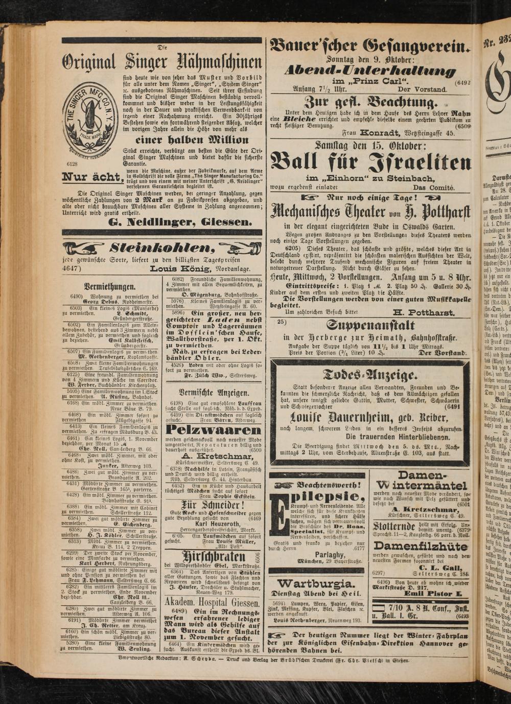 Die Original Singer Maschinen werden, bet geringer Anzahlung, gegen wöchentliche Zahlungen von 2 Mark an zu Fabrikpreisen abgegeben, und alte oder nicht brauchbare Maschinen aller Systeme in Zahlung angenommen; Unterricht wird gratis ertheilt.