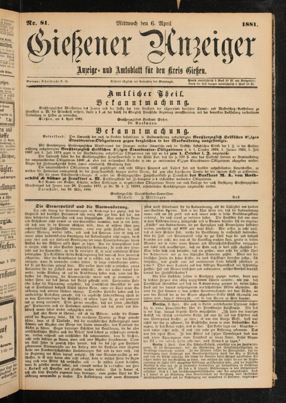 Gießen, am 4 April 1881. GroßherzoglickeS Krei-amt Gießen.