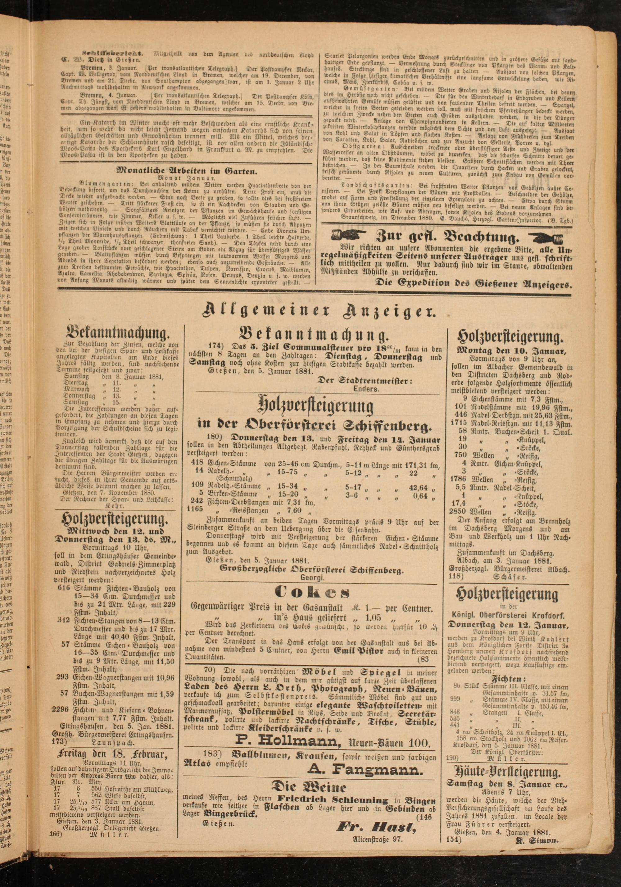 4 rm Scheitholz, 24 rm Knüppel I. El., 158 rm Stockholz und 1062 rm Reiser- Krofdorf, den 5. Januar 1881.