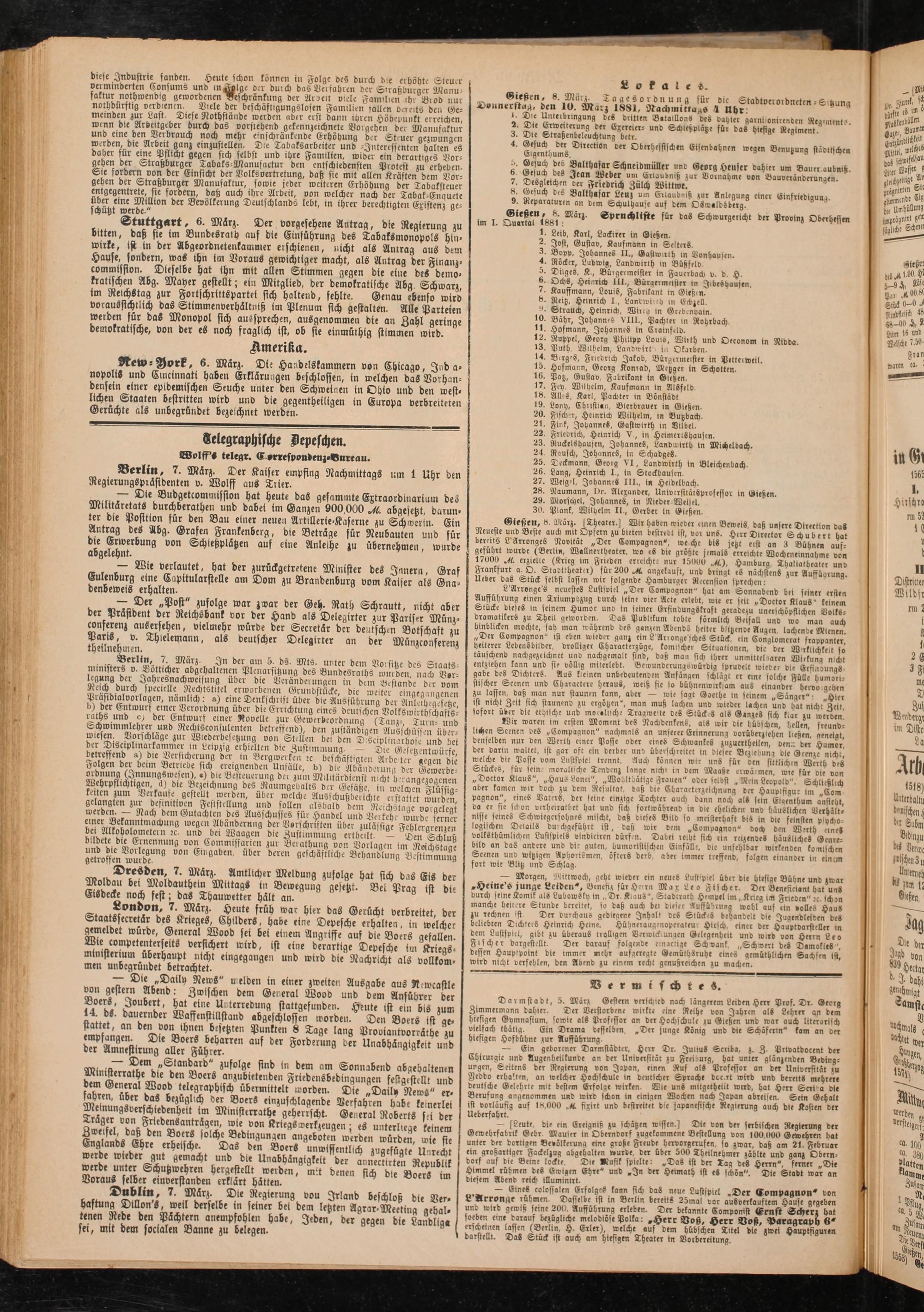 Patz, Gustav, Fabrikant in Gießen. Fey. Wilhelm, Kaufmann in Alsfeld. Alb«, Karl, Pachter in Bönstadt Lony, Christian, Bierbrauer in Gießen- Fisch'r, Heinrich Wilhelm, in Butzbach. Fink, Johannes, Gastwirth in Dtlbel. Friedrich, Heinrich V, in Heimerlshausrn. Ruckelshaujen, Johannes, Landwtrth in Michelbach. Rausch, Johannes, in Schadges.