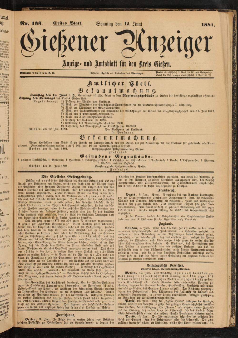 Gießen, am 10. Juni 1881. Der Vorsitzende deS Kreistags.