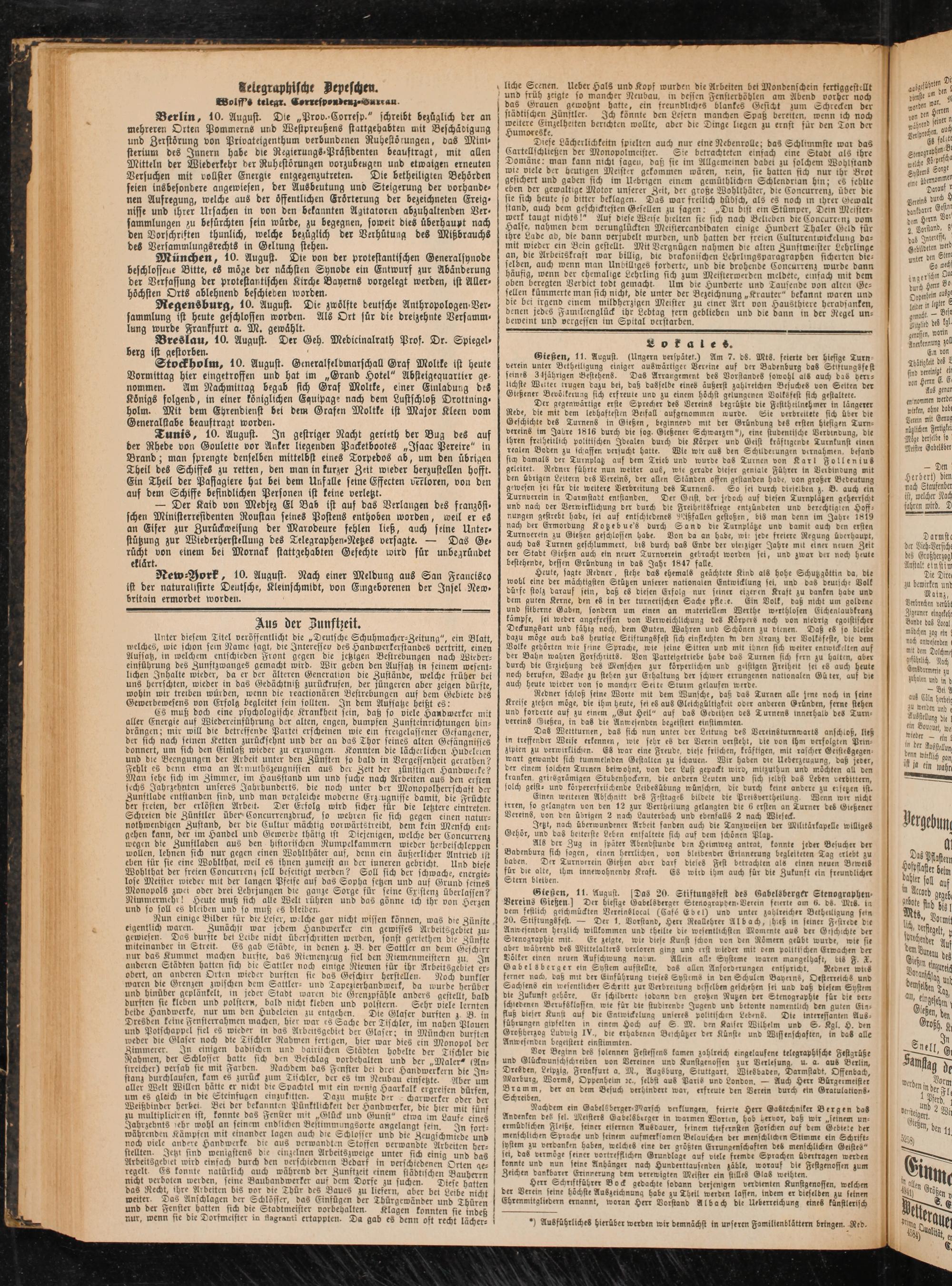 Gießen, 11. August. (Ungern verspätet.) Am 7. dS. Mts. feierte der hiesige Turn verein unter Brtheiligung einiger auswärtiger Vereine auf der Badenburg das Stiftungsfest seines 31jährigen Bestehens. Das Arrangement des Vorstandes sowohl als auch das herrlichste Wuter trugen dazu bei, daß dasselbe eines äußerst zahlreichen Besuches von Seiten bet Gießener Bevölkerung sich erfreute und zu einem höchst gelungenen Volksfest sich gestaltete.