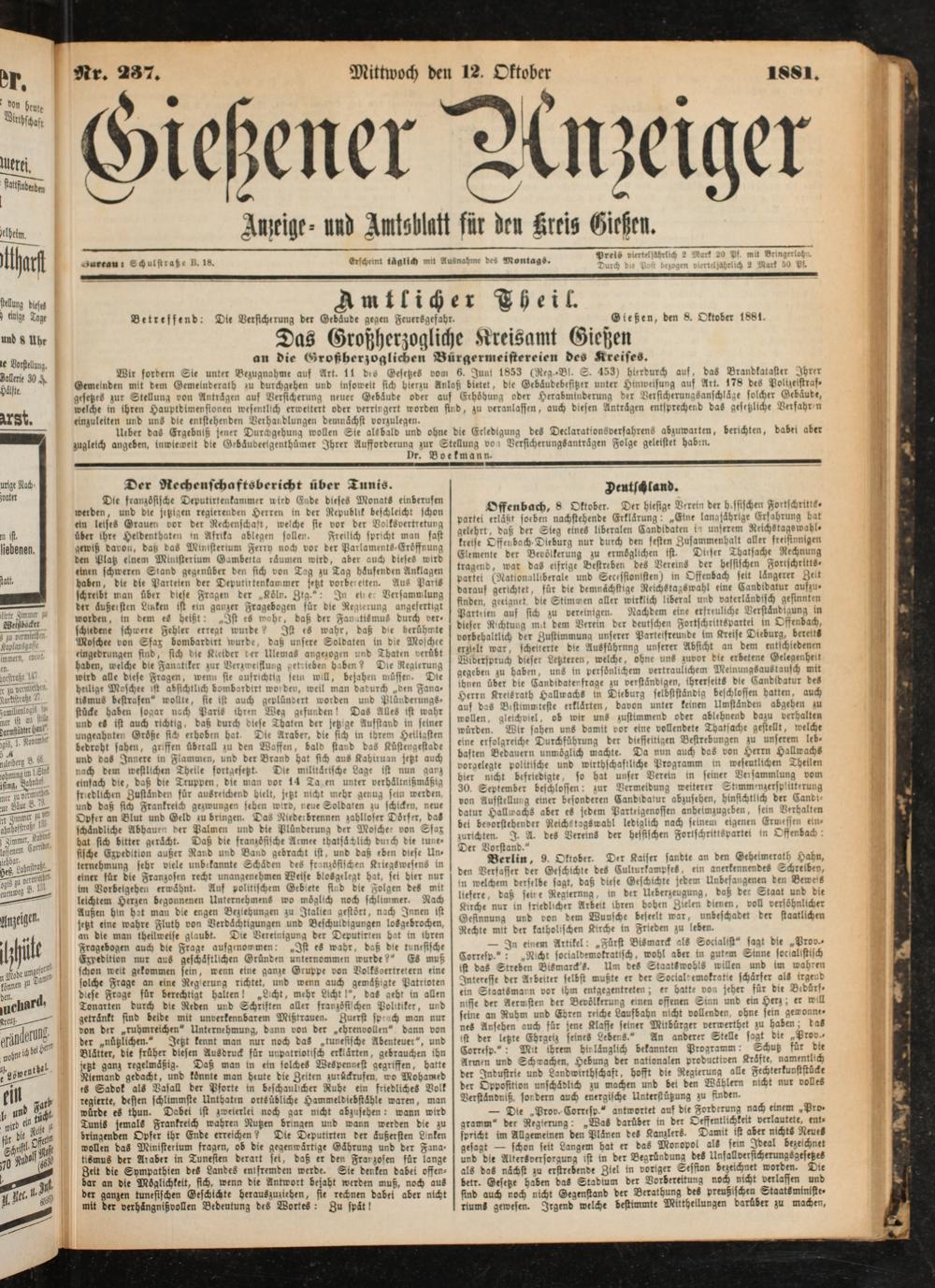 Aasige- unb Amtsblatt für hm Kreis Gießen.