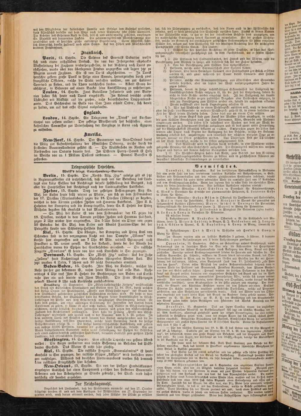 Paris, 15. Septbr. Die (Solenne deS Generals Sabattier wollte sich nack einem mißglückten Versuch, die von den Insurgenten abgelenkre Wasserleitung bei Zaghuan wiederherzustellen, in der Richtung nach Tunis zurückziehen, wurde aber von überlegenen Feinden angegriffen und lagert jetzt zu Megrlm unweit Zaghuan. Sie ist von Tu'is abzeschnttten. — In Tunis herrschte gestern große Panik in Folge einer Erneute, hervorgerufen durch zwei französische Osfictere, welche die Stadt verlaffrn wollten, um zur Colonne Corr^ard zu stoßen, und die Thore verschloffen fanden. — Albert Grcvy be- absichtlgt, in Besancon aus einem Banket seine Amtsführung zu rechtfertigen.