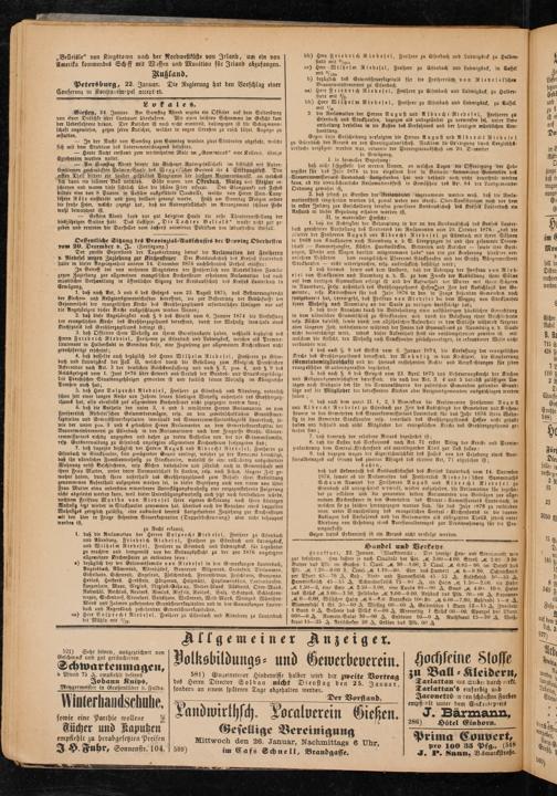 Gießen, 24. Januar. Am Samstag Abend wurde ein Officier auf dem Seltersweg von einer Droschke oder Landauer überfahren. Mit einer leichten Schramme im Gesicht kam der Ueberfahrene davon. Der Kutscher ist noch nicht ermittelt, dahingegen ist die Schutzmannschaft angewiesen, gegen jeden Kutscher, welcher in engen Straßen zu rasch fährt, Anzeige zu erstatten.