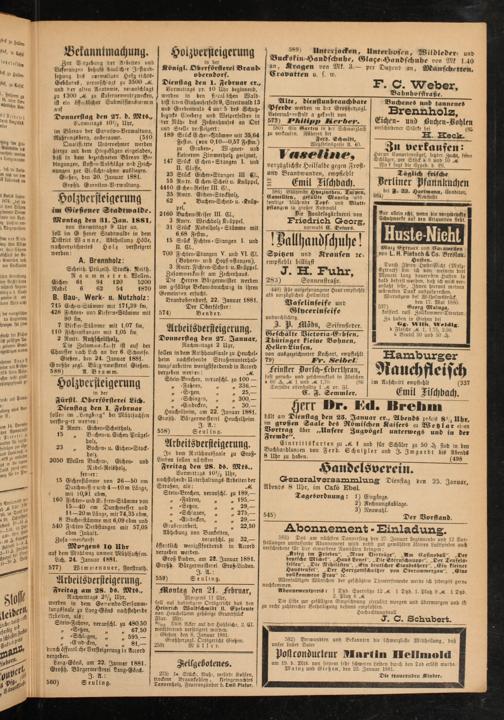 Holzverfteigerung im Gießener Stadtwalde. Montag den 31. Jan. 1881, von Vormittag- 9 Uhr an, soll im G (jener Stadtwalde in dem Dtftrict Wanne, Abtheilung Hölle, nachverzeichnetes Holz versteigert werden: