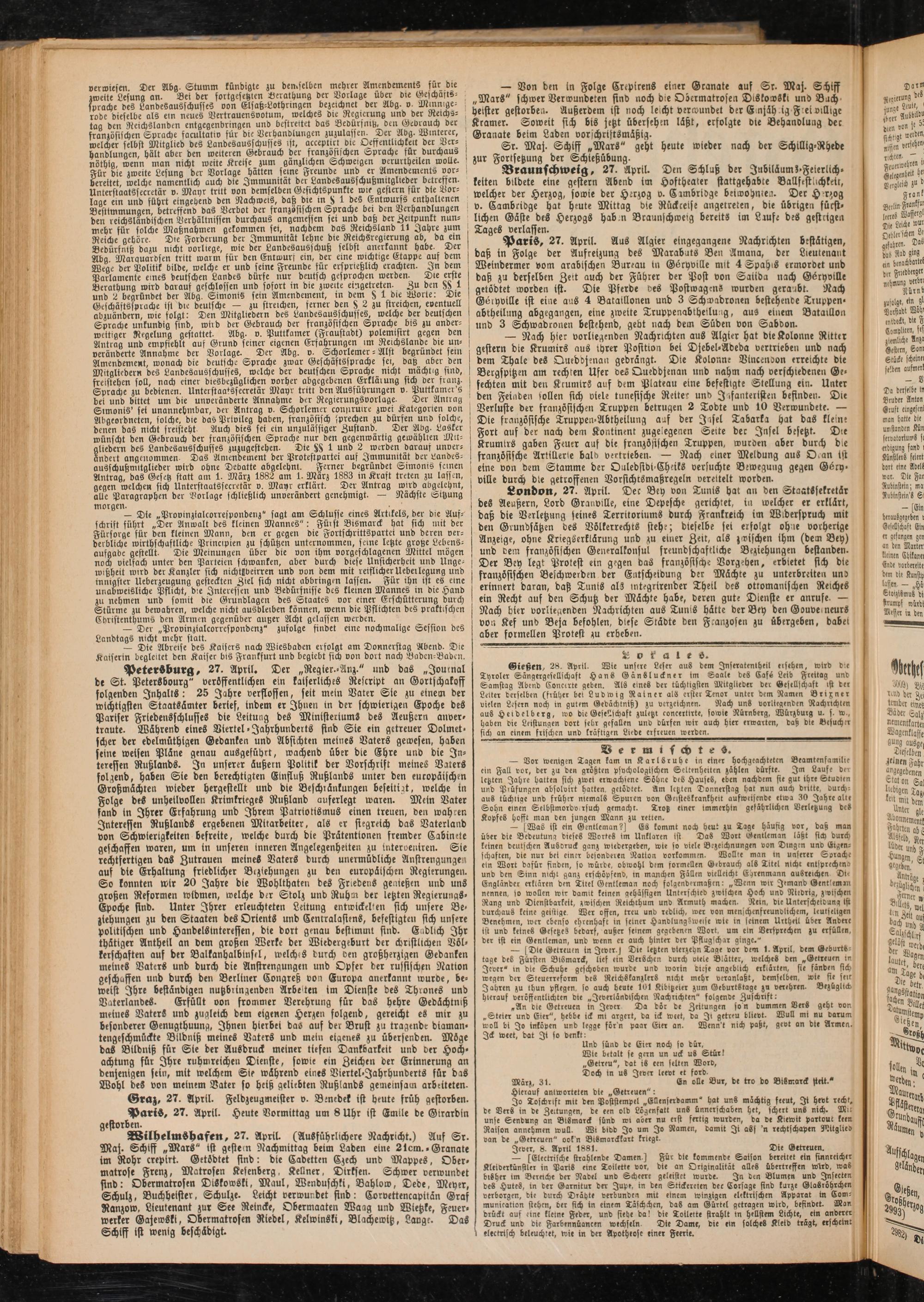 London, 27. April. Dec Bey von Tunis hat an den Staatssekretär i des Aeußern, Lord Granville, eine Depesche gerichtet, in welcher er erklärt, daß bie Verletzung seines Territoriums burch Frankreich im Wiberspruch mit den Grundsätzen des Völkerrechts stehe; dieselbe sei erfolgt ohne vorherige Anzeige, ohne Kriegserklärung unb zu einer Zeit, als zwischen ihm (bem Bey) und Dem französischen Generalkonsul freundschaftliche Beziehungen bestanden.