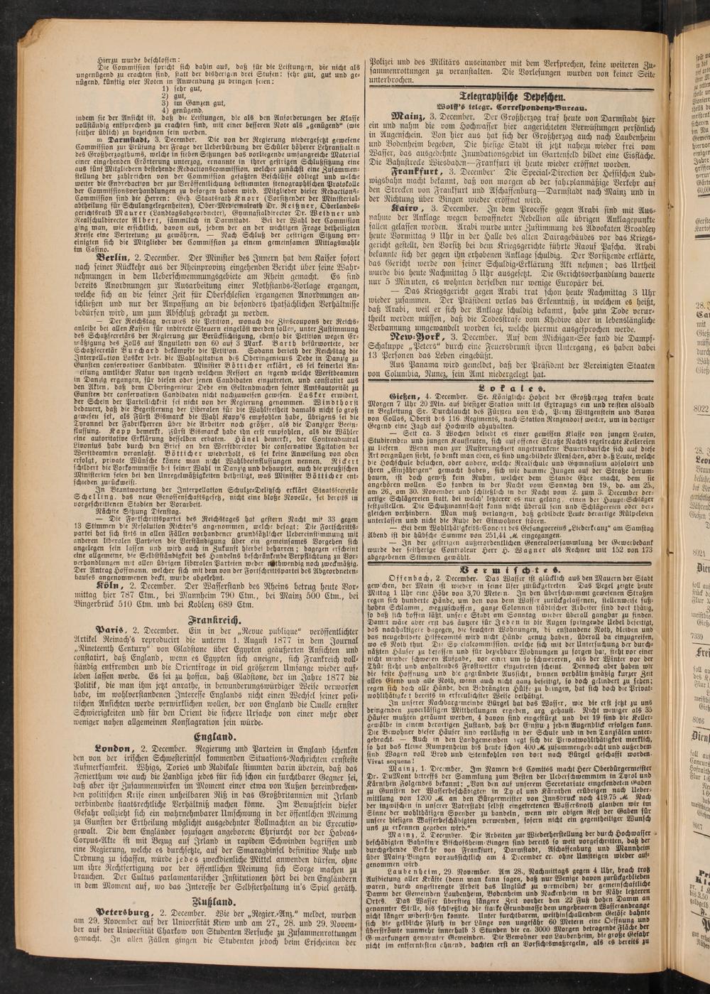 Mainz, 3. December. Der Großherzog traf heute von Darmstadt hier ein und nahm die vom Hochwasser hier angerichteten Verwüstungen persönlich in Augenschein. Von hier aus hat sich der Großherzog auch nach Laubenheim und Bodenheim begeben, Die hiesige Stadt ist jetzt nahezu wieder frei vom Wasser, das ausgedehnte Jnundationsgebiet im Gartenseld bildet eine Eisfläche. Die Bahnstrecke Wiesbaden—Frankfurt ist heute wieder eröffnet worden.