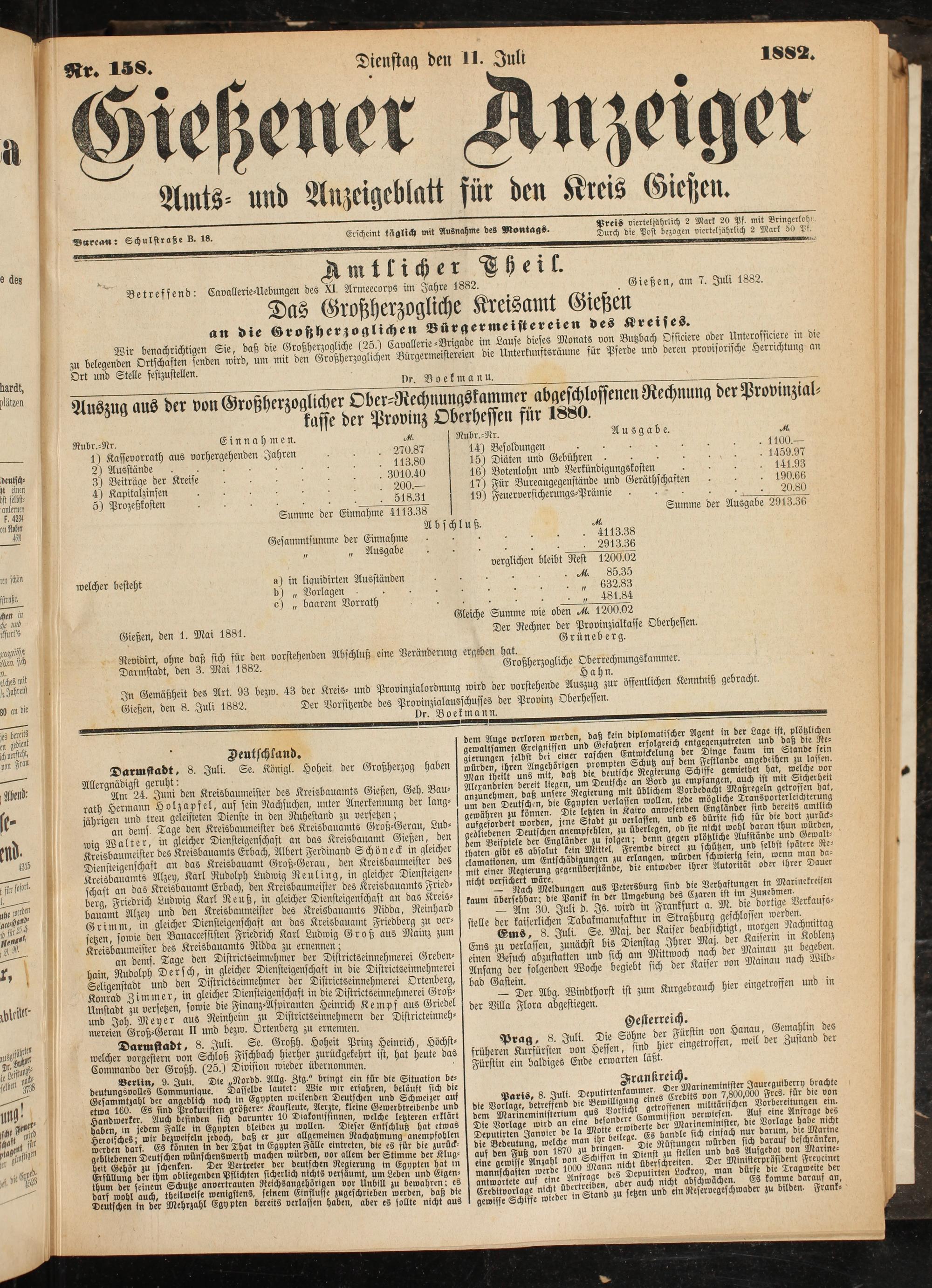 Gießm, den 8. Juli 1882. Der Vorsitzende des Provinzialausschusses der Provmz Oberhessen.
