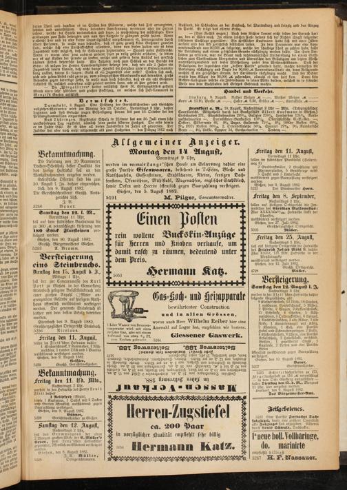 Vormittags 9 Uhr, werden im vormalsLangeAschen Hause am Seltersweg dahier eine große Parthie Eifenwaaren, bestehend in P-Eisen, Blech- und Radschaufeln, Gossensteinen, Stahlscharen, Nieten, fertigen Dachfenstern, Ofenröhren, Mühlstahl, Wagenachsen, englisches Stahlblech, sowie Oefen und Heerde öffentlich gegen Baarzahlung versteigert. Gießen, den 5. August 1882.