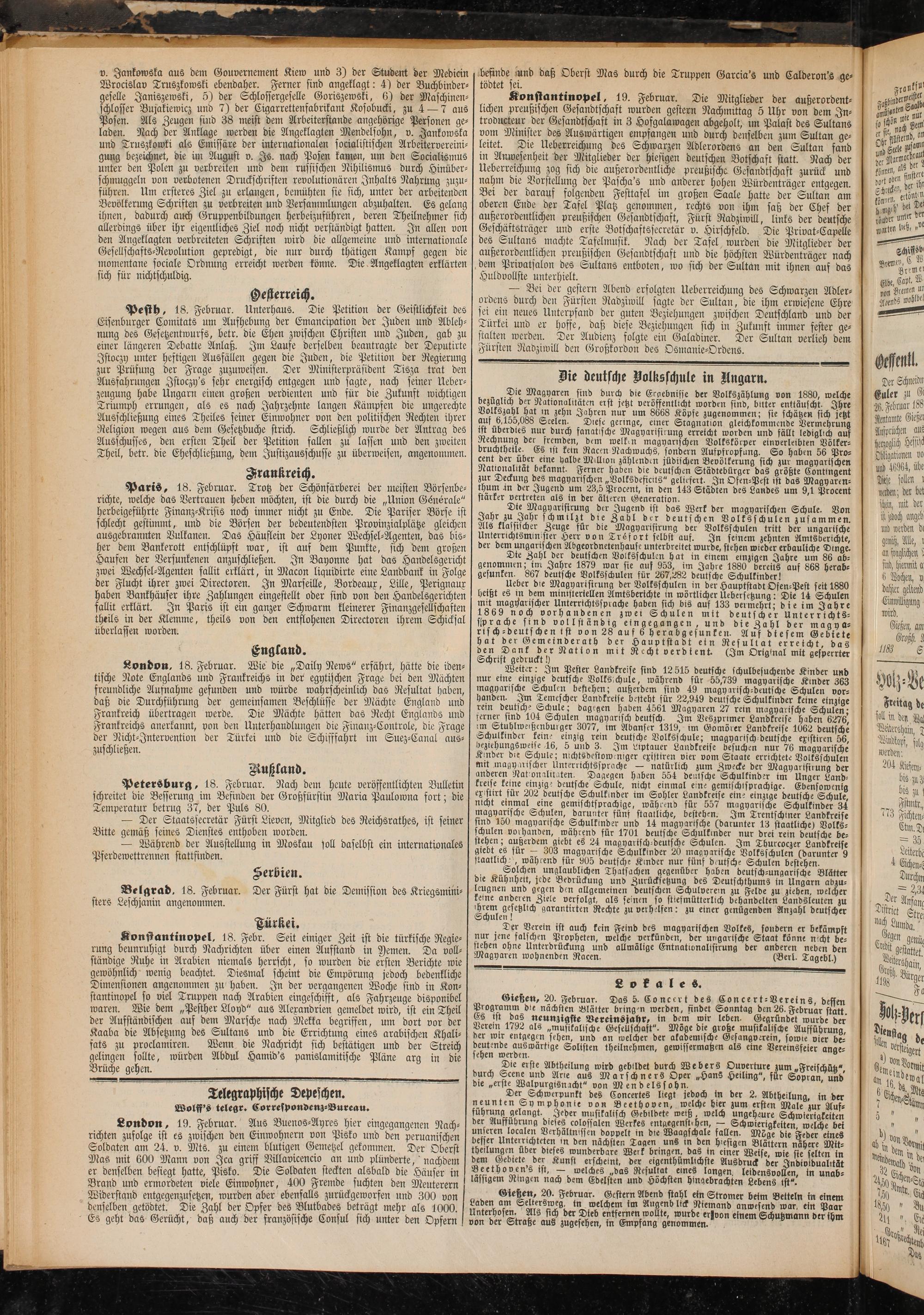 Pesth, 18. Februar. Unterhaus. Die Petition der Geistlichkeit des Eisenburger Comitats um Aufhebung der Emancipation der Juden und Ablehnung des Gesetzentwurfs, betr. die Ehen zwischen Christen und Juden, gab zu einer längeren Debatte Anlaß. Im Laufe derselben beantragte der Deputirte Jstoczy unter heftigen Ausfällen gegen die Juden, die Petition der Regierung zur Prüfung der Frage zuzuweisen. Der Ministerpräsident Tisza trat den Ausführungen Jstoczy's sehr energisch entgegen und sagte, nach seiner Ueber- zeugung habe Ungarn einen großen verdienten und für die Zukunft wichtigen Triumph errungen, als es nach Jahrzehnte langen Kämpfen die ungerechte Ausschließung eines Theiles seiner Einwohner von den politischen Rechten ihrer Religion wegen aus dem Gesetzbuche strich. Schließlich wurde der Antrag des Ausschusses, den ersten Theil der Petition fallen zu lassen und den zweiten Theil, betr. die Eheschließung, dem Justizausschusse zu überweisen, angenommen.