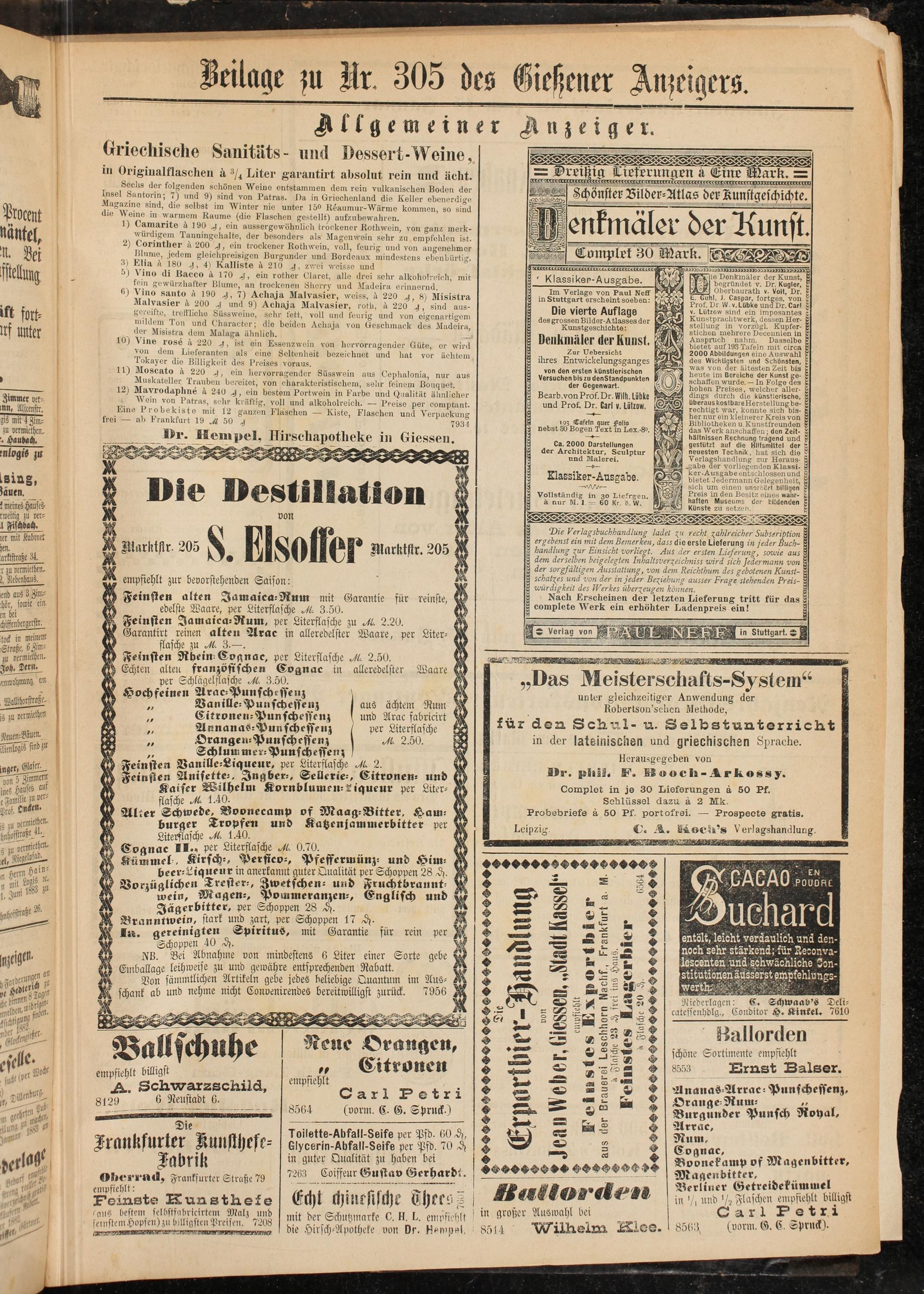 Bie Denkmäler der Kunst, P begründet v. Dr. Kugler, & Oberbaurath v. Volt, Dr. P E. Guhl, J. Caspar, fortges. von Prof. Dr.W.v.Lübke und Dr. Carl £ v. Lützow sind ein imposantes c Kunstprachtwerk, dessen Herstellung in vorzügl. Kupfer- 8 stieben mehrere Decennien in ? Anspruch nahm. Dasselbe J bietet auf 193 Tafeln mit circa 5 2000 Abbildungen eine Auswahl « des Wichtigsten und Schönsten, was von aer ältesten Zeit bis £ heute im Bereiche der Kunst ge- \ schaffen wurde. — In Folge des K hohen Preises, welcher aller- V dings durch die künstlerische, ; überaus kostbare Herstellung be- J rechtigt war, konnte sich bis- s her nur ein kleinerer Kreis von a Bibliotheken u.Kunstfreunden x das Werk anschaffen; den Zeit- hältnissen Rechnung tragend und $ gestützt auf die Hilfsmittel der t neuesten Technik, hat sich die f Verlagshandlung zur Heraus- E ^-abe der vorliegenden Klassi- B ker. Ausgabe entschlossen und S bietet Jedermann Gelegenheit, E sich um einen unerhört billigen S Preis in den Besitz eines wahr- E. haften Museums der bildenden S Künste zu setzen.