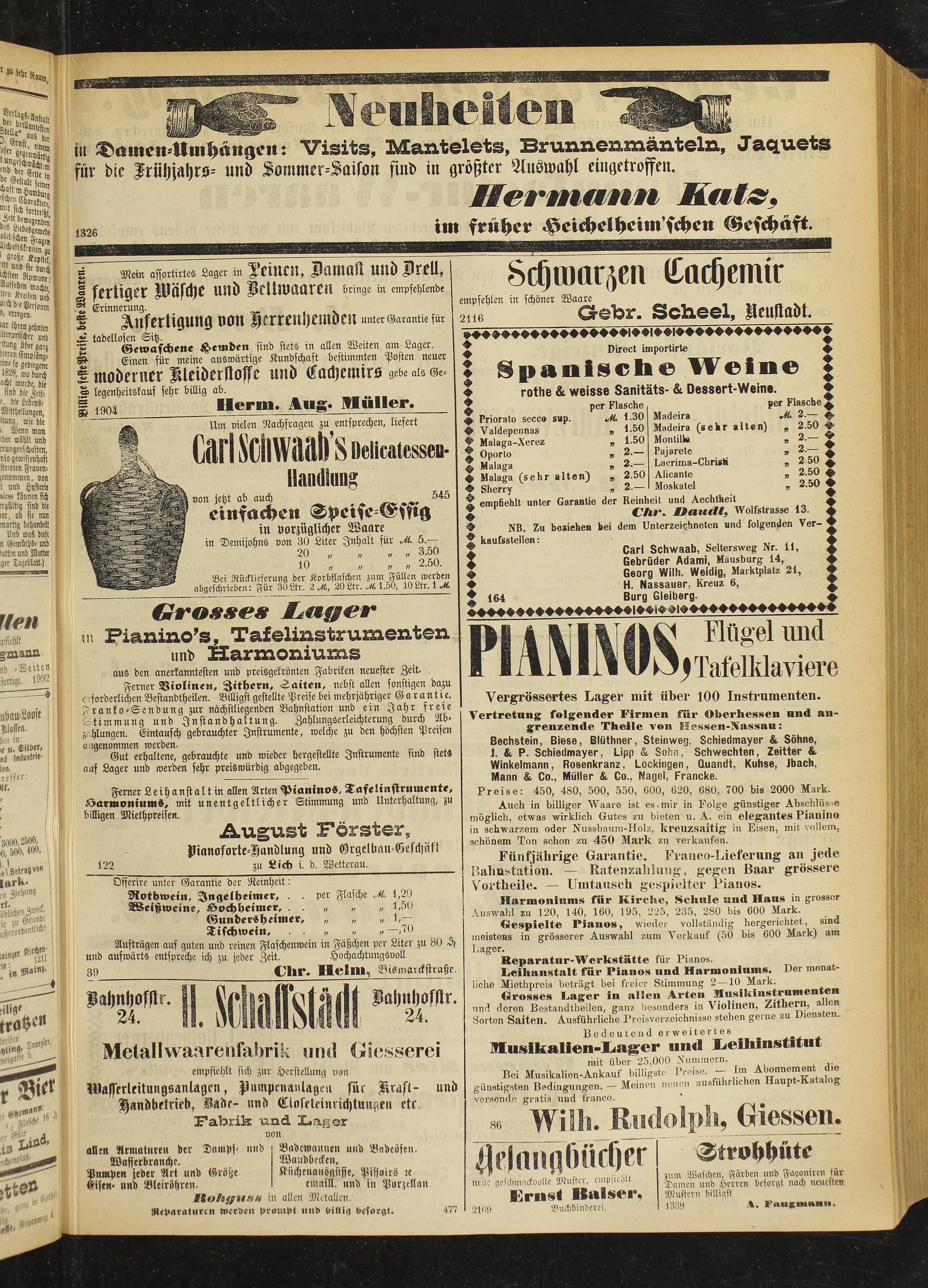 Vertretung folgender Firmen für Oberhessen und angrenzende Theile von Hessen-Nassau: Sechstem, Biese, Blüthner, Steinweg, Schiedmayer & Söhne, J. & P. Schiedmayer, Lipp & Sohn, Schwechten, Zeitter & Winkelmann, Rosenkranz, Lockingen, Quandt, Kuhse, Jbach, Mann &, Co., Müller & Co., Nagel, Francke.