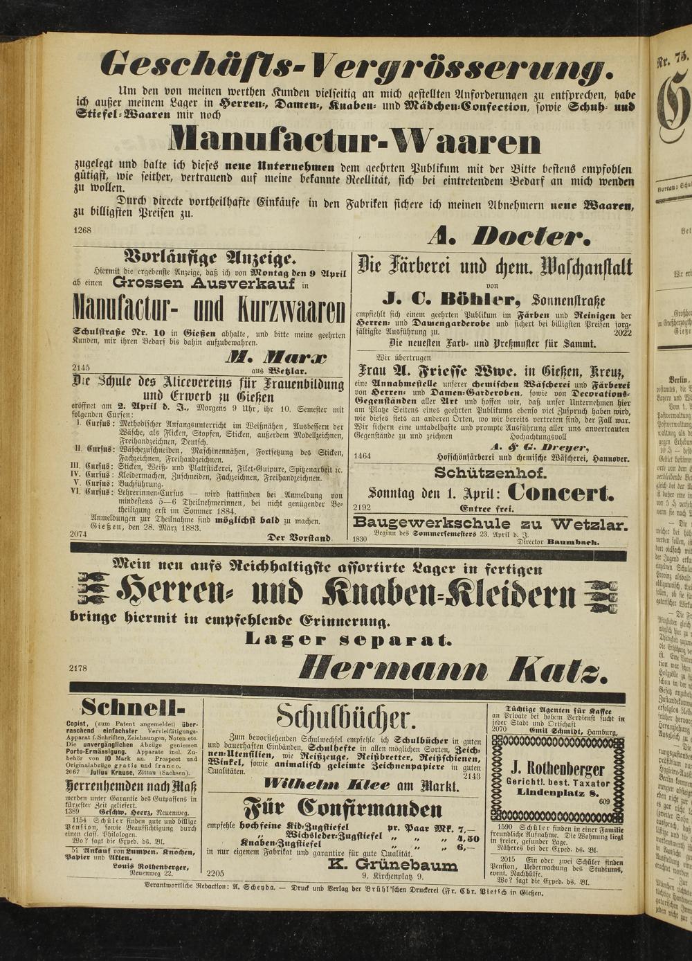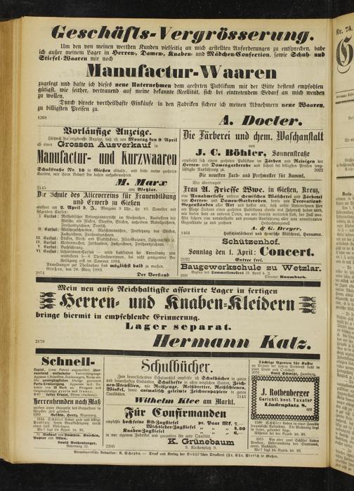 Hiermit die ergebenste Anzeige, daß ich von Montag den 9 April ab einen Grossen Ausverkauf in VMM- und Kurzwaaren Schulstraße Nr. 10 in Gießen abhalte, und bitte meine geehrten Kunden, mir ihren Bedarf bis dahin aufzubewahren.